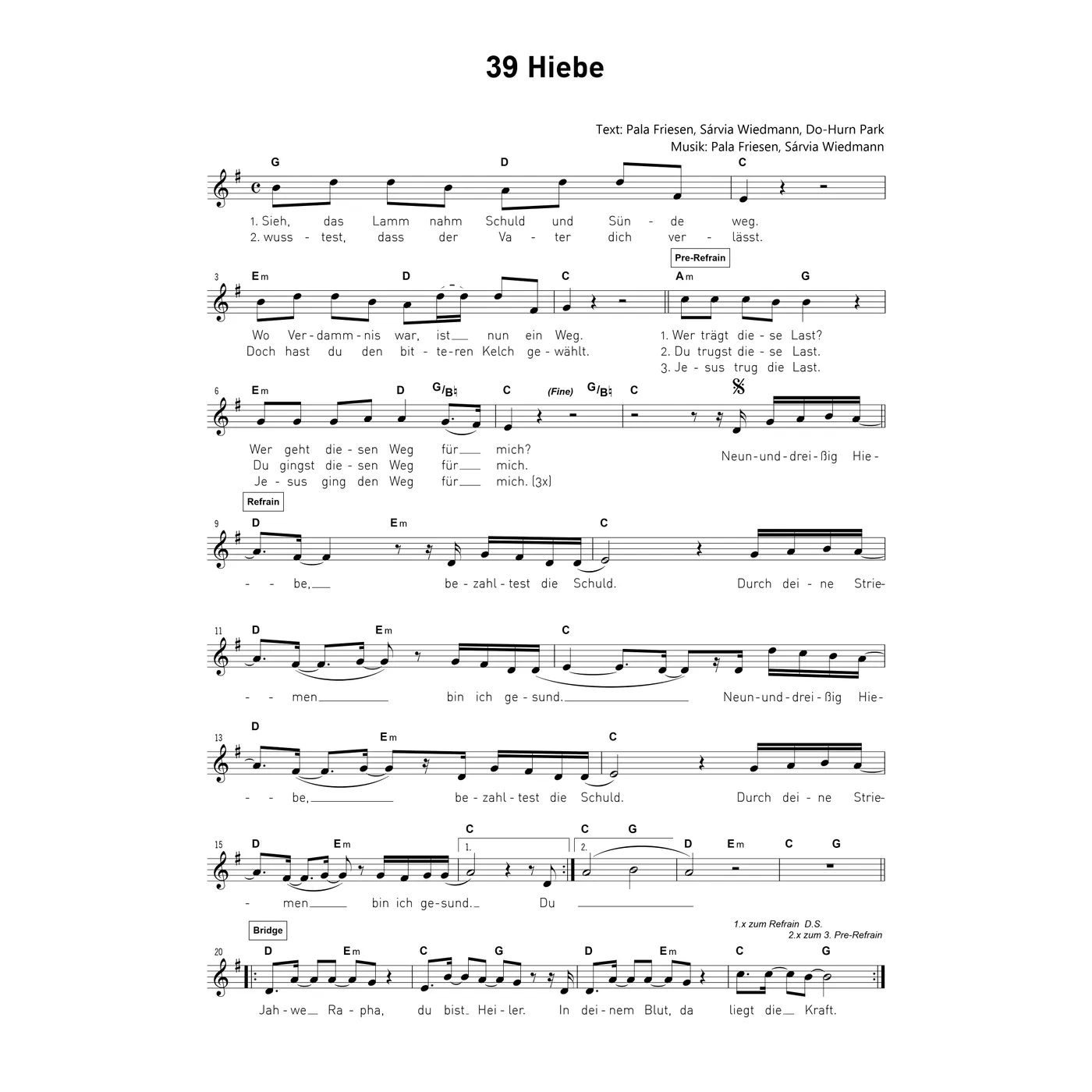 39 Hiebe (diese Variante haben Sie gerade ausgewählt) (Worship, einstimmig, G-Dur) Pala Friesen (Melodie, Text), Sárvia Löwen (Text, Melodie), Do-Hurn Park (Text) |
