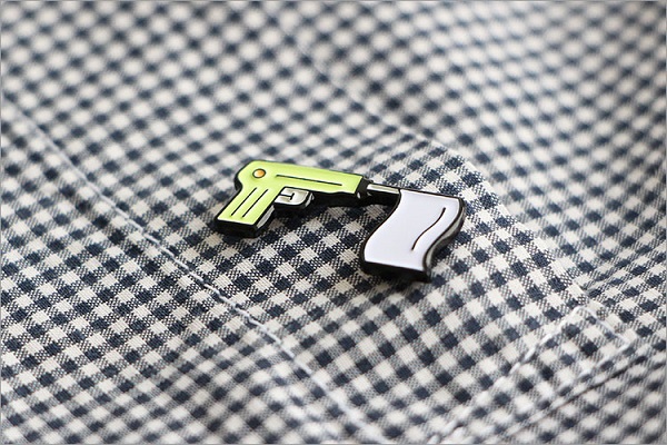 Designer Sebastian Hoffmann nimmt die Jahreslosung ins Visier: mit Wasserspritzpistole und Friedensfahne. Entstanden ist ein Ansteckpin.