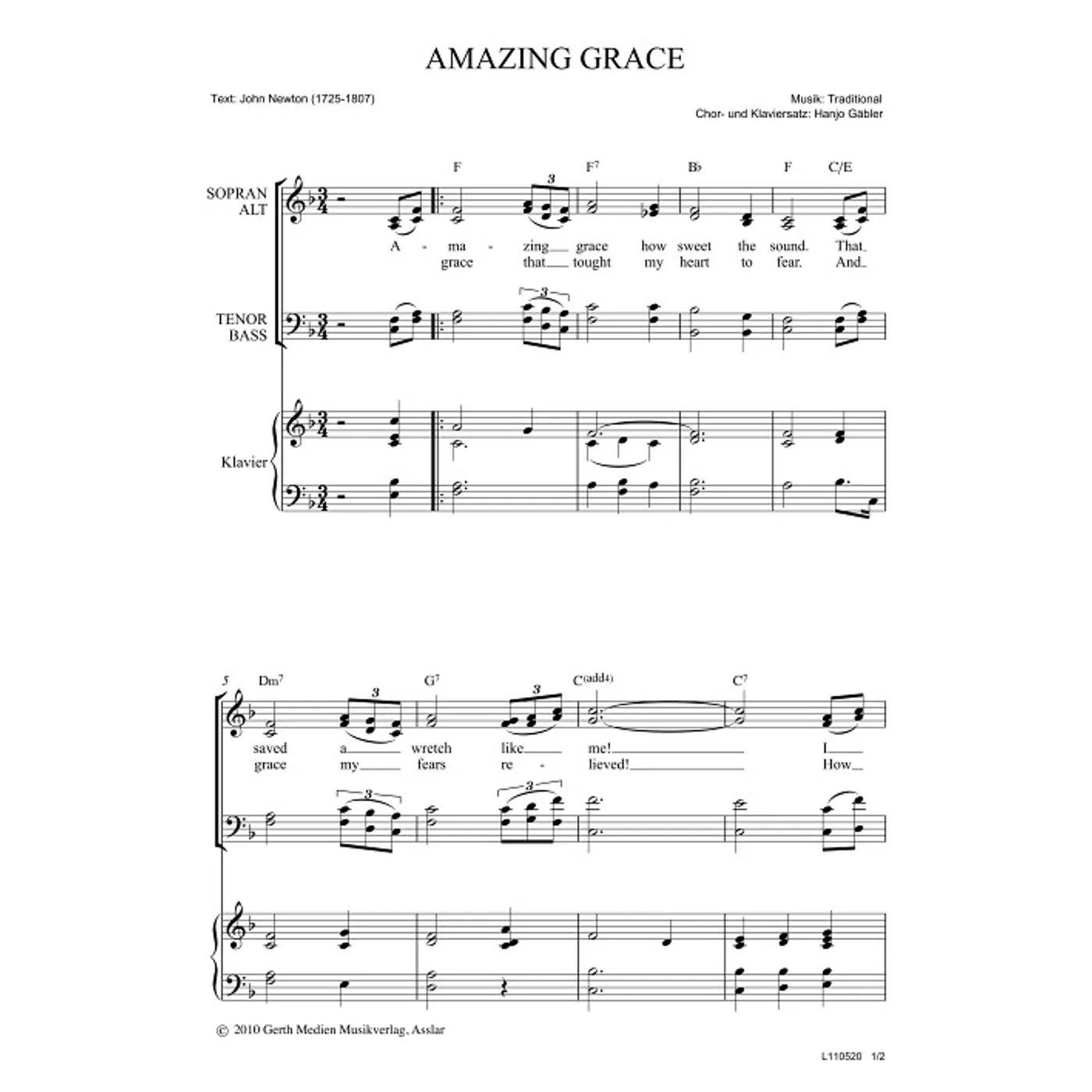 Amazing Grace (diese Variante haben Sie gerade ausgewählt) (traditionell, Klavier, gemischter Chor, mit Akkorden, vierstimmig, F-Dur) John Newton (Text), Hanjo Gäbler (Klaviersatz) |