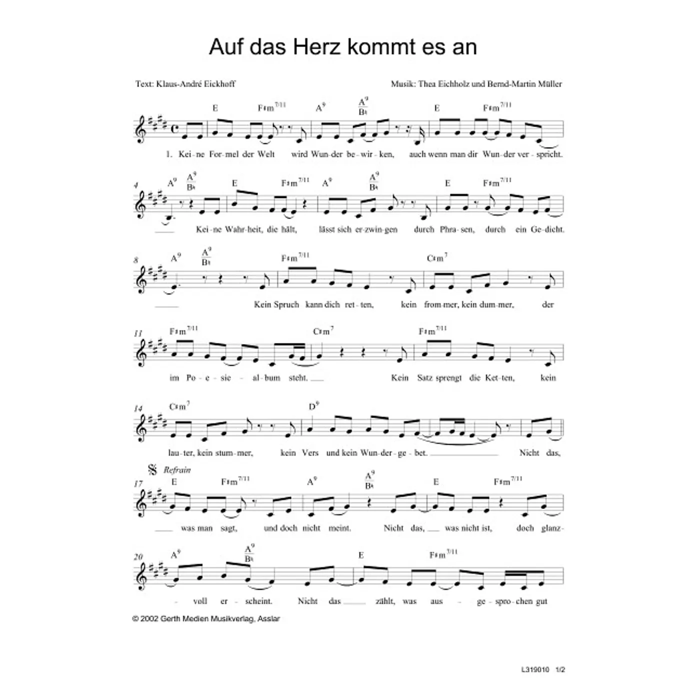 Auf das Herz kommt es an (diese Variante haben Sie gerade ausgewählt) (modern, einstimmig, mit Akkorden, E-Dur) Thea Eichholz (Komposition), Bernd-Martin Müller (Komposition), Klaus-André Eickhoff (Text) |