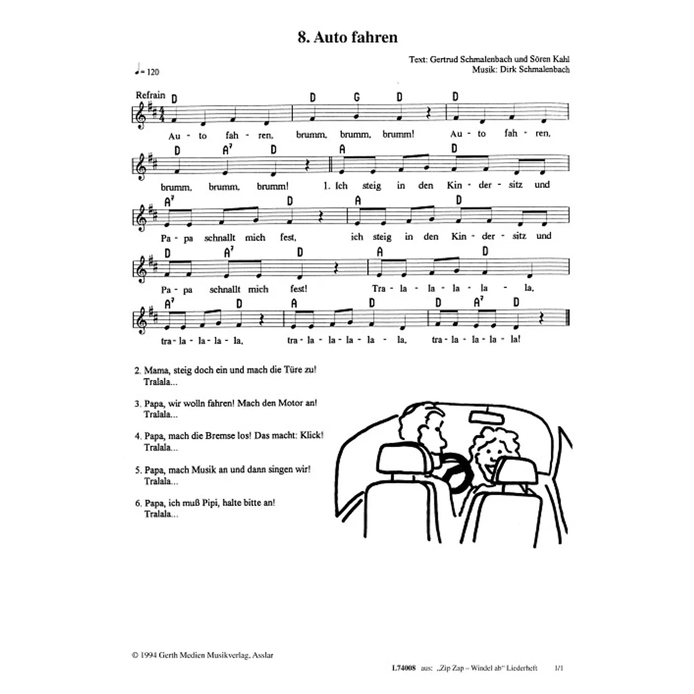Auto fahren (diese Variante haben Sie gerade ausgewählt) (einstimmig, mit Akkorden, D-Dur) Dirk Schmalenbach (Komposition), Sören Kahl (Text), Gertrud Schmalenbach (Text) |