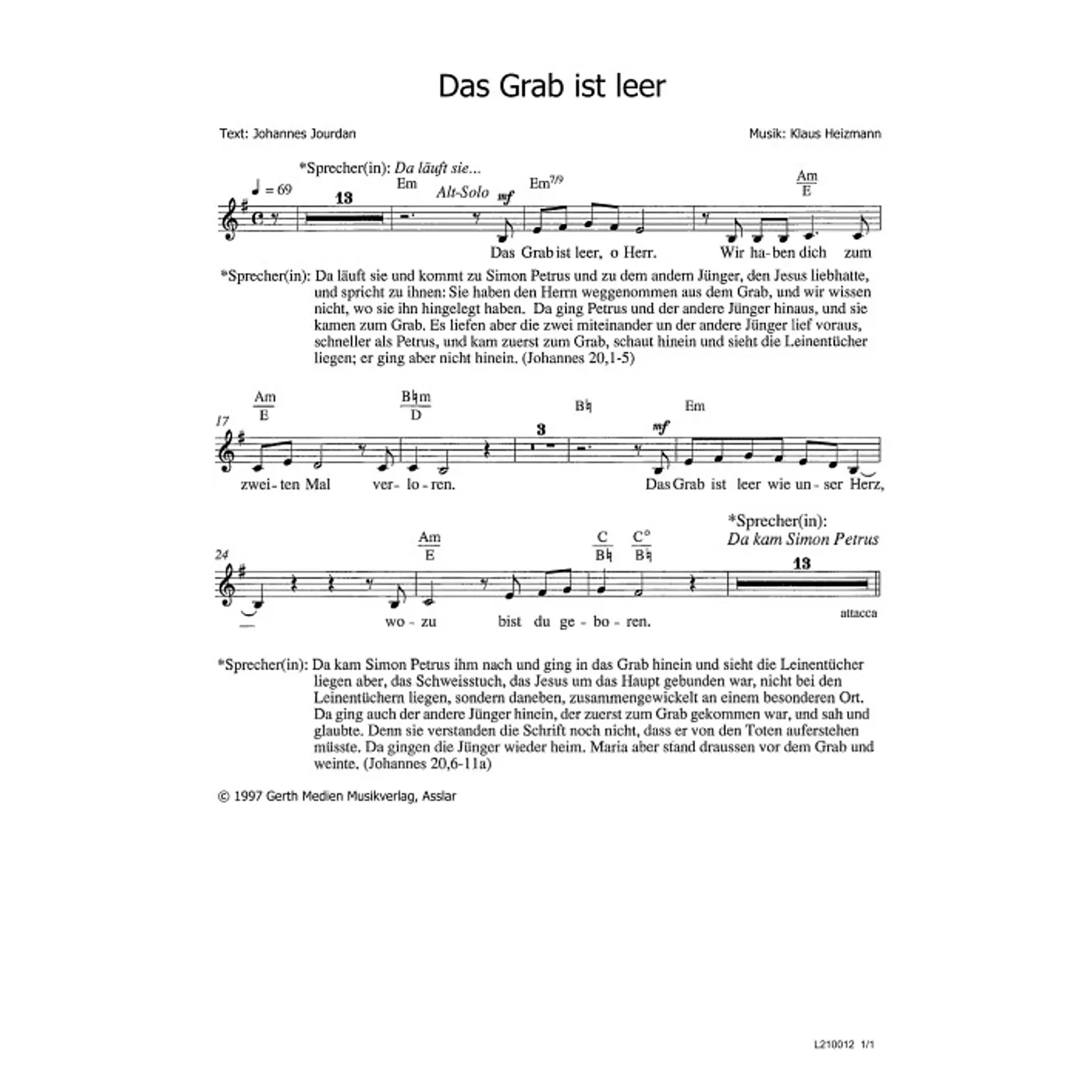 Das Grab ist leer (diese Variante haben Sie gerade ausgewählt) (Kantate, Solostimme, einstimmig, gemischter Chor, mit Akkorden, E-Moll) Johannes Jourdan (Text), Klaus Heizmann (Komposition) |