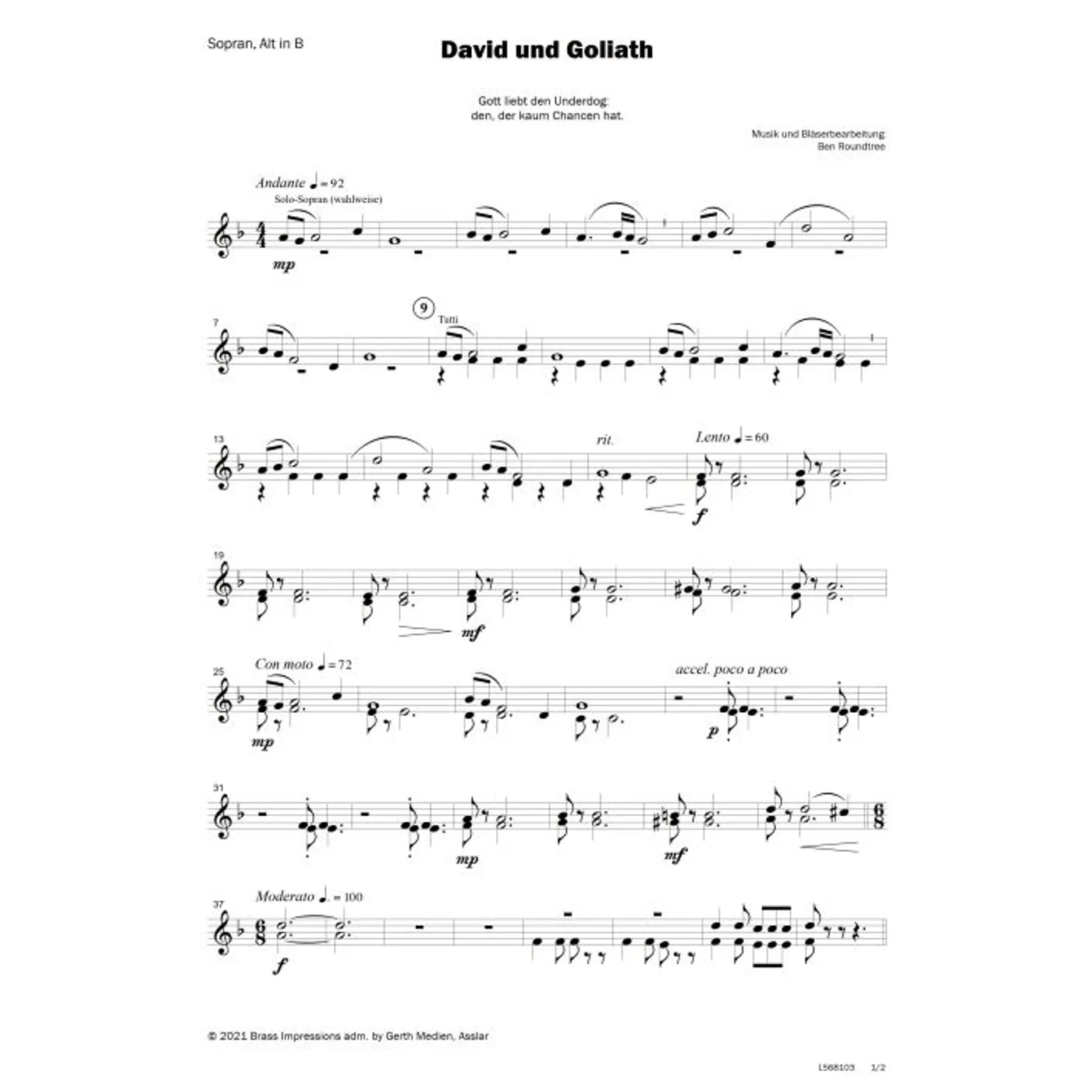 David und Goliath (modern, Bläser, Bläserpartitur, Partituren, vierstimmig) Ben Roundtree (Komposition, Bläsersatz) | modern, Bläser, Bläserpartitur, Partituren, vierstimmig | 3,80 € |
