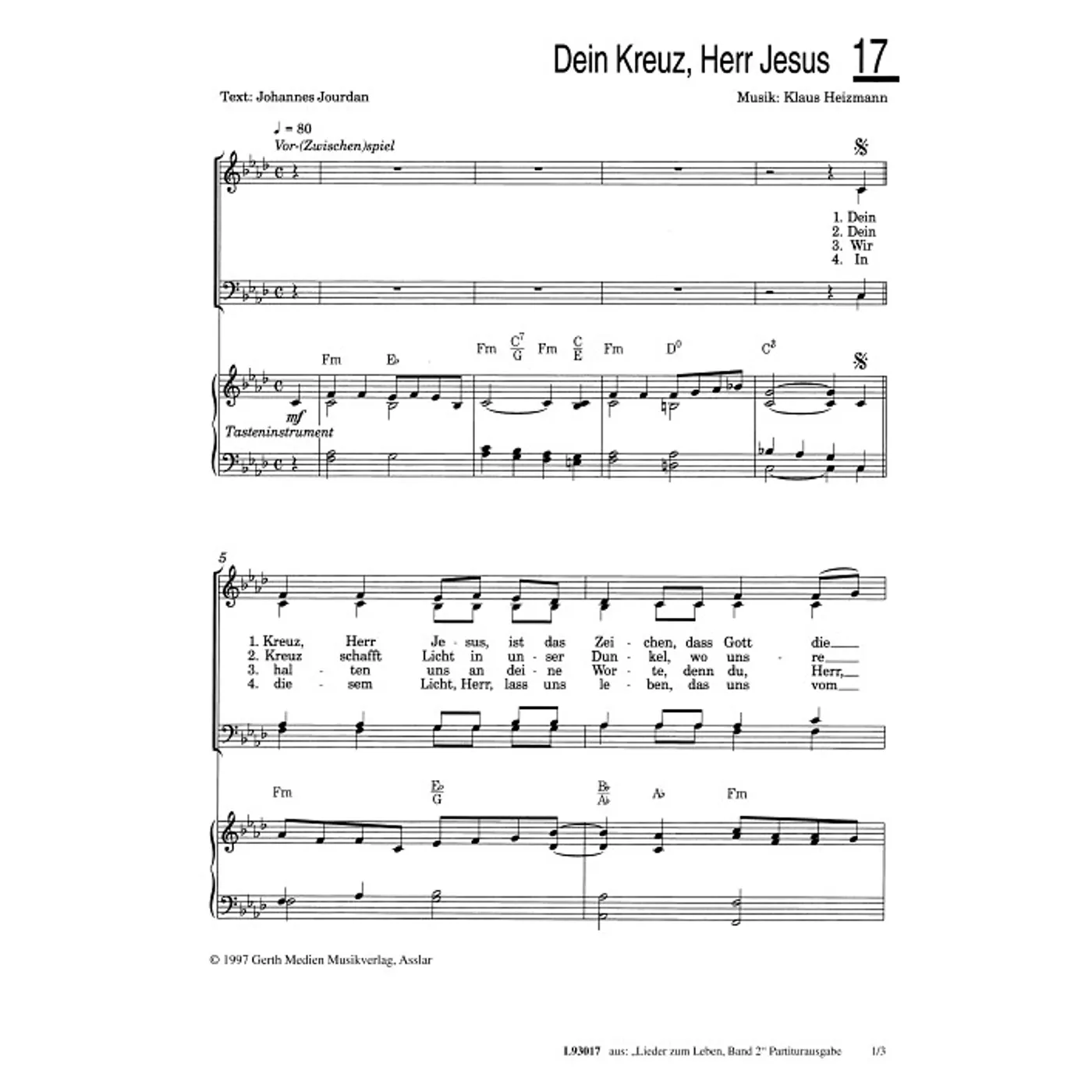 Dein Kreuz, Herr Jesus (traditionell, gemischter Chor, mit Akkorden, vierstimmig, F-Moll) Klaus Heizmann (Komposition), Johannes Jourdan (Text) | traditionell, gemischter Chor, mit Akkorden, vierstimmig, F-Moll | 1,50 € |