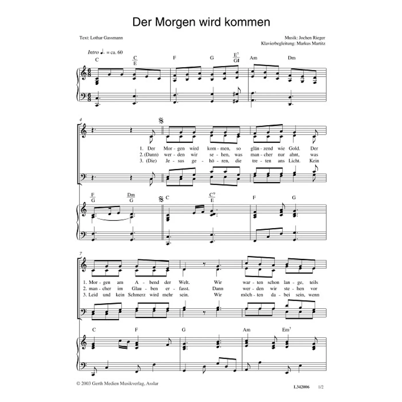Der Morgen wird kommen (diese Variante haben Sie gerade ausgewählt) (modern, Klavier, gemischter Chor, mit Akkorden, vierstimmig, C-Dur) Jochen Rieger (Komposition), Lothar Gassmann (Text), Markus Martitz (Bearbeiter) |