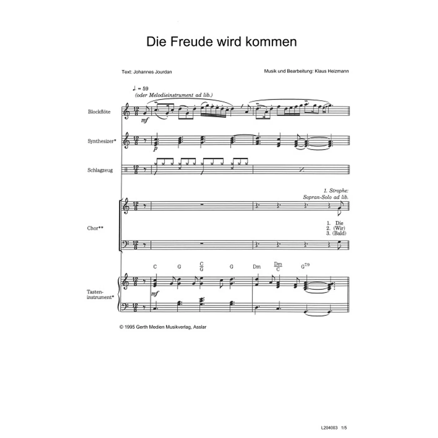 Die Freude wird kommen (Kantate, Solostimme, dreistimmig, gemischter Chor, mit Akkorden, C-Dur) Klaus Heizmann (Komposition), Johannes Jourdan (Text) | Kantate, Solostimme, dreistimmig, gemischter Chor, mit Akkorden, C-Dur | 1,50 € |
