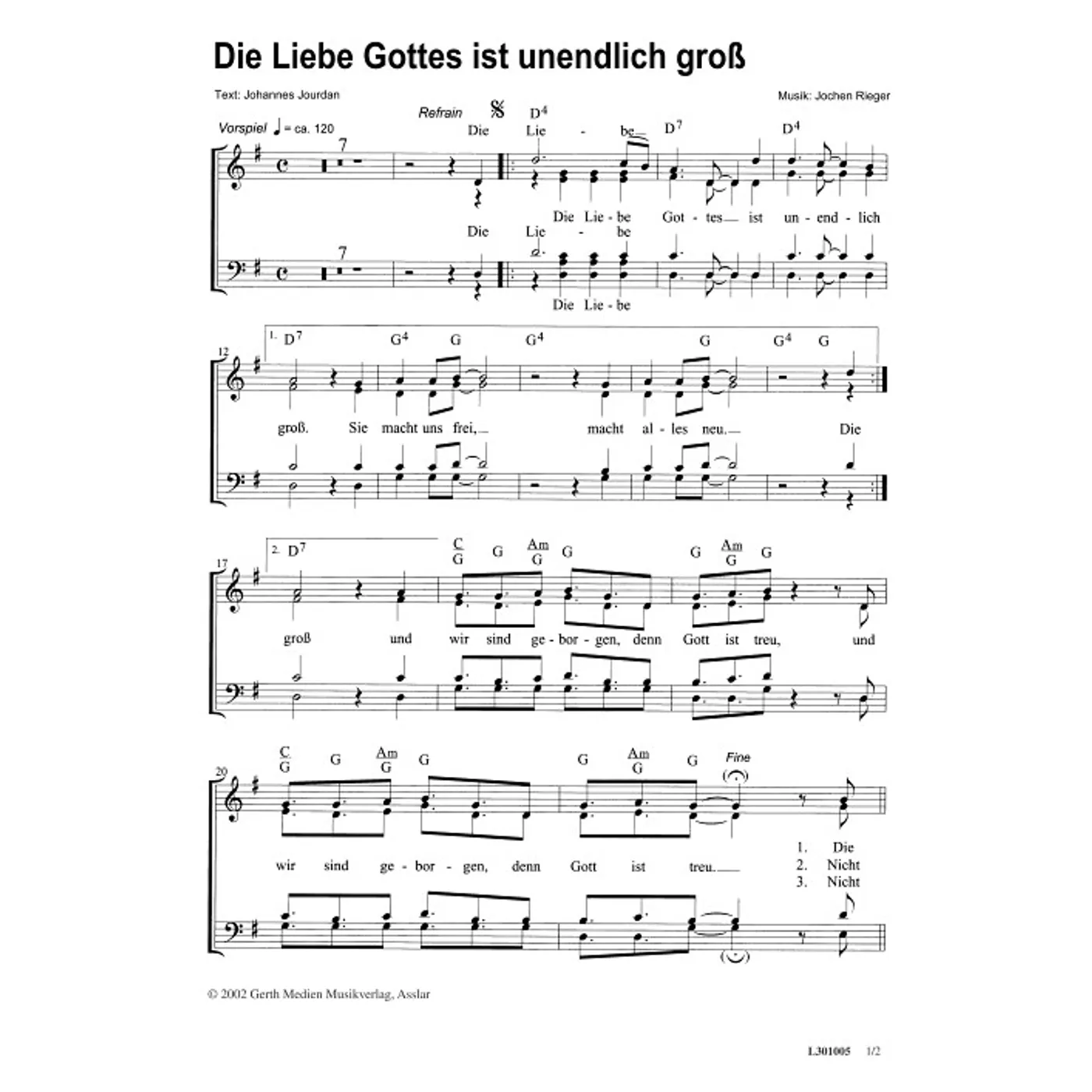 Die Liebe Gottes ist unendlich groß (diese Variante haben Sie gerade ausgewählt) (modern, gemischter Chor, mit Akkorden, vierstimmig, G-Dur) Johannes Jourdan (Text), Jochen Rieger (Komposition, Chorsatz) |