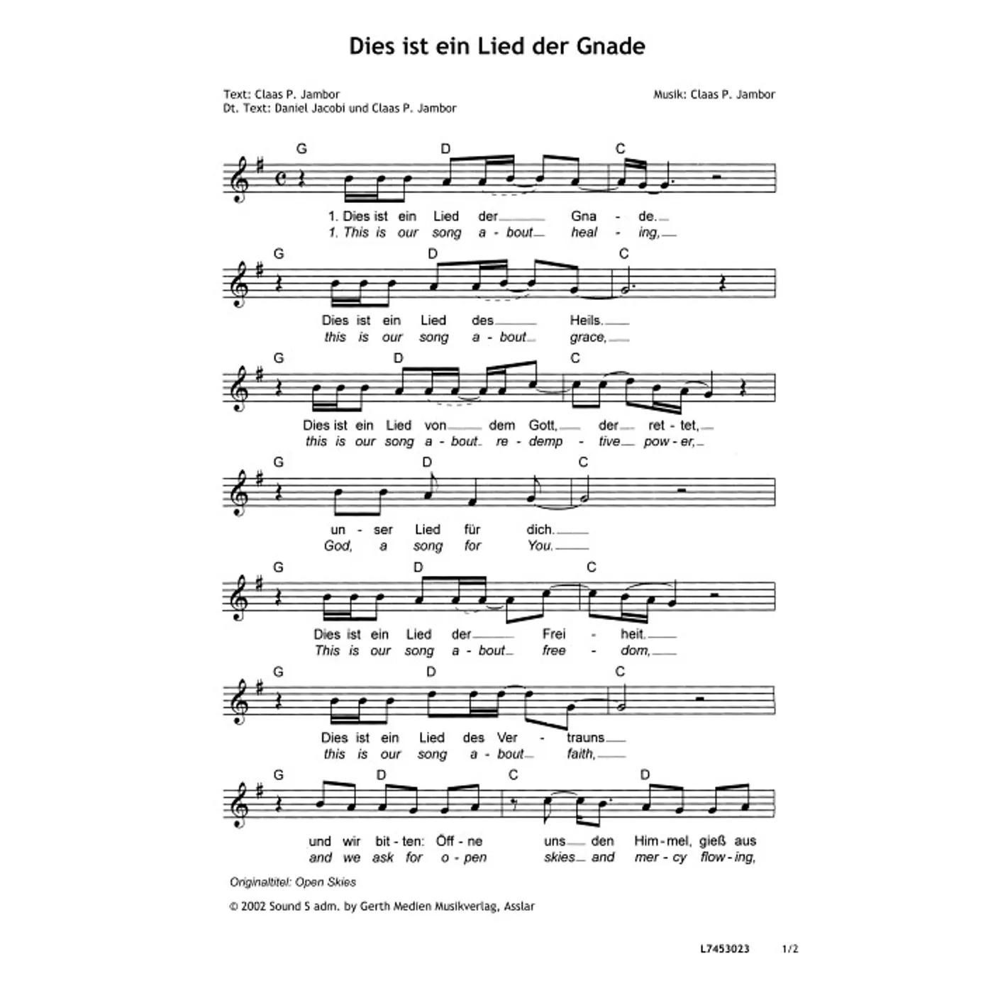 Dies ist ein Lied der Gnade (diese Variante haben Sie gerade ausgewählt) (einstimmig, mit Akkorden, G-Dur) Claas-P. Jambor (Komposition, Text), Daniel Jacobi |