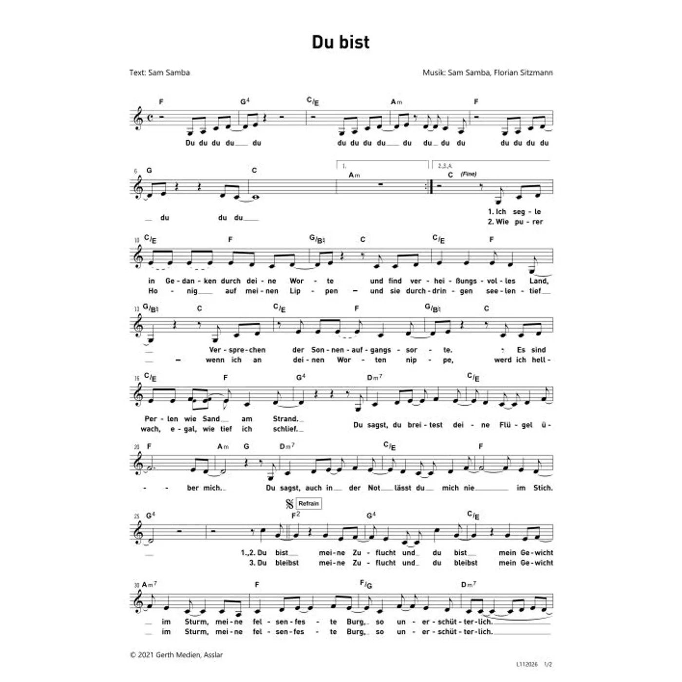 Du bist (diese Variante haben Sie gerade ausgewählt) (modern, einstimmig, mit Akkorden, C-Dur) Sam Samba (Komposition, Text), Florian Sitzmann (Komposition) |