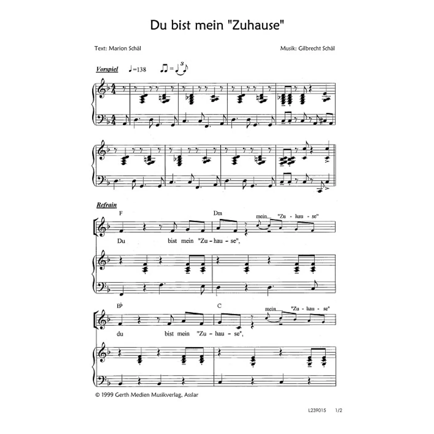Du bist mein Zuhause (diese Variante haben Sie gerade ausgewählt) (Klavier, einstimmig, mit Akkorden, F-Dur) Gilbrecht Schäl (Komposition), Marion Schäl (Text) |