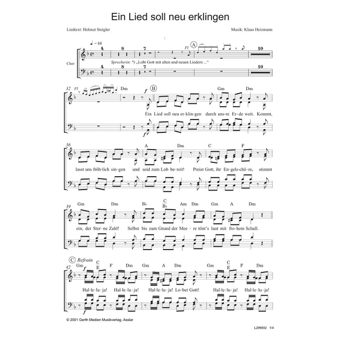 Ein Lied soll neu erklingen (diese Variante haben Sie gerade ausgewählt) (Kantate, traditionell, gemischter Chor, mit Akkorden, vierstimmig, D-Moll) Klaus Heizmann (Komposition, Chorsatz), Helmut Steigler (Text) |