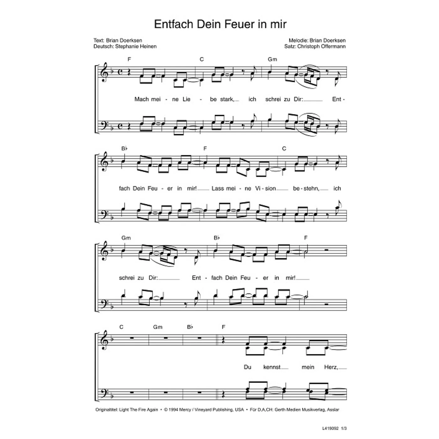 Entfach dein Feuer in mir (diese Variante haben Sie gerade ausgewählt) (modern, gemischter Chor, mit Akkorden, vierstimmig, F-Dur) Brian Doerksen (Komposition, Text), Christoph Offermann (Chorsatz), Stephanie Heinen (Übersetzung) |