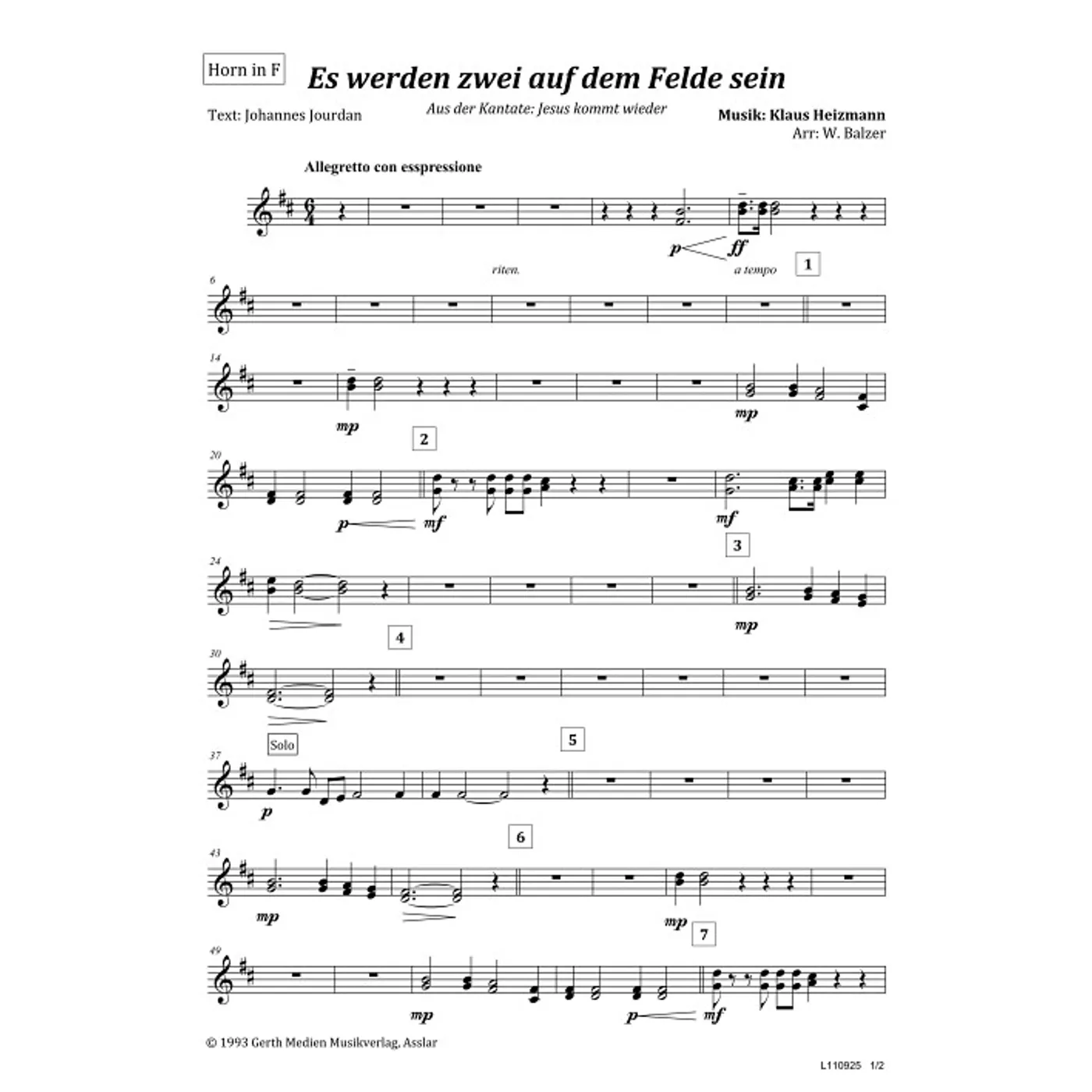 Es werden zwei auf dem Felde sein (Horn in F) (diese Variante haben Sie gerade ausgewählt) (traditionell, Orchestereinzelstimme) Klaus Heizmann (Komposition), Johannes Jourdan (Text), Waldemar Balzer (Bearbeiter, Bearbeitung) |
