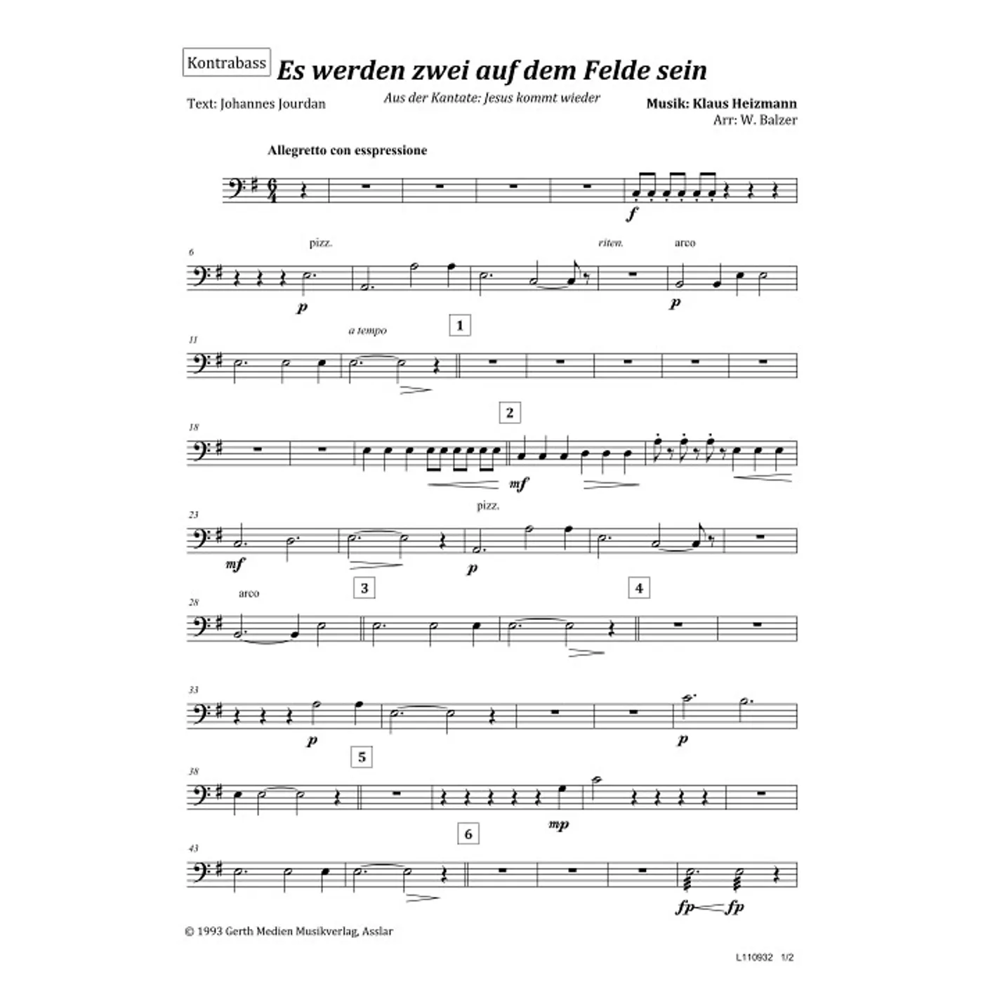 Es werden zwei auf dem Felde sein (Kontrabass) (diese Variante haben Sie gerade ausgewählt) (traditionell, Orchestereinzelstimme) Klaus Heizmann (Komposition), Johannes Jourdan (Text), Waldemar Balzer (Bearbeiter, Bearbeitung) |