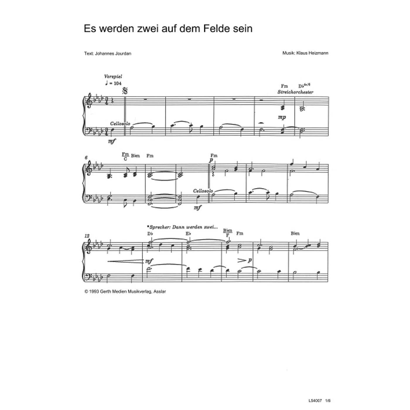 Es werden zwei auf dem Felde sein (Kantate, traditionell, gemischter Chor, mit Akkorden, zweistimmig, F-Moll) Johannes Jourdan (Text), Klaus Heizmann (Komposition) | Kantate, traditionell, gemischter Chor, mit Akkorden, zweistimmig, F-Moll | 1,50 € |