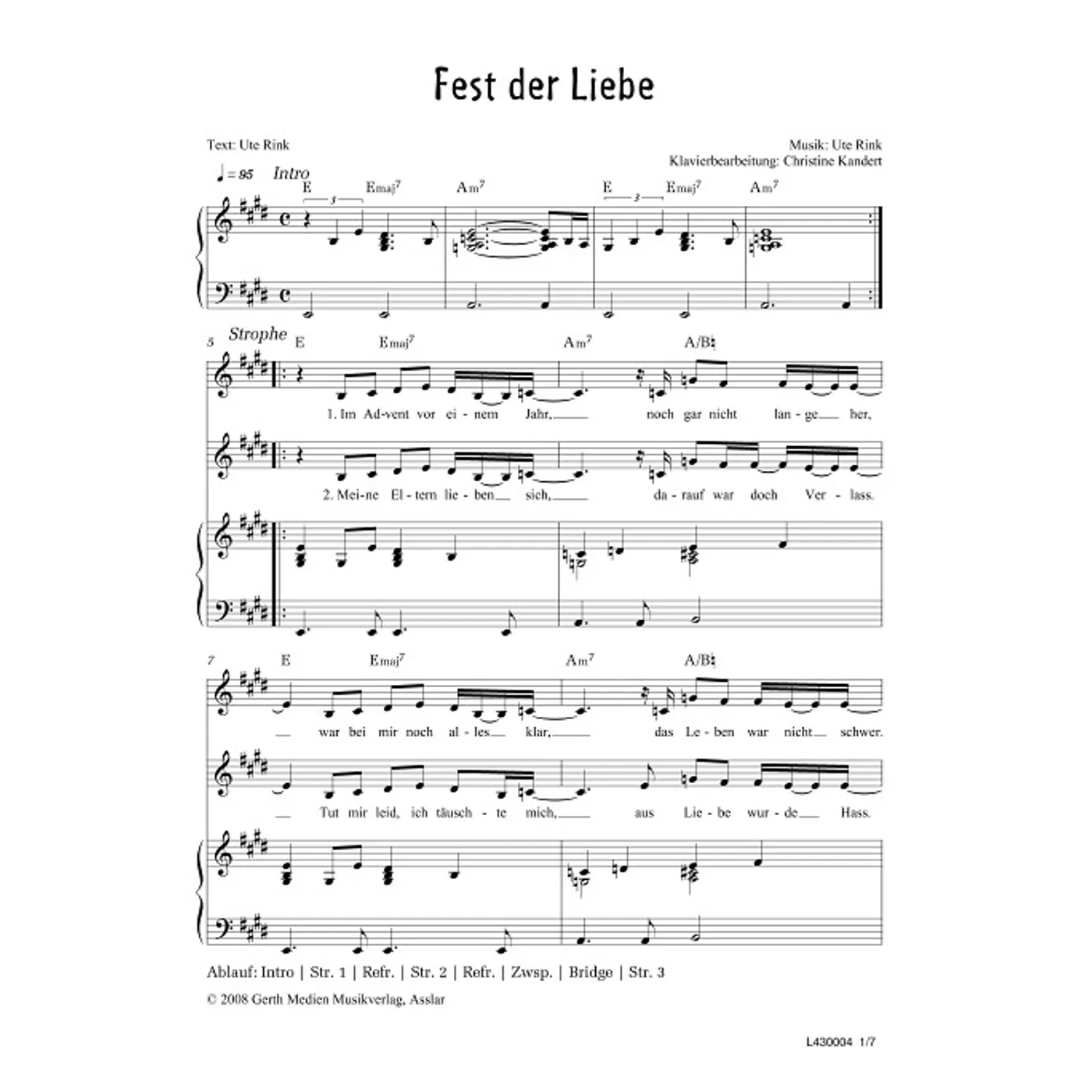 Fest der Liebe (diese Variante haben Sie gerade ausgewählt) (Klavier, einstimmig, mit Akkorden, E-Dur) Ute Rink (Komposition, Text), Christine Kandert (Bearbeiter) |