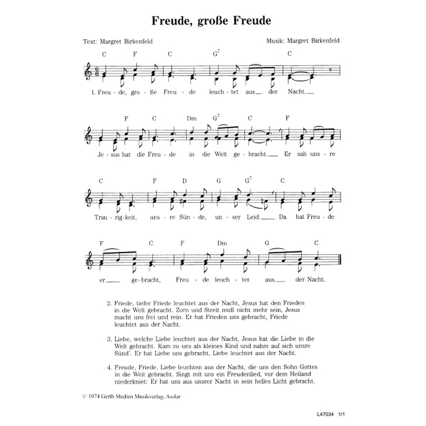 Freude, große Freude (diese Variante haben Sie gerade ausgewählt) (Gemeindelied, traditionell, Kinderchor, mit Akkorden, zweistimmig, C-Dur) Margret Birkenfeld (Komposition, Text) |