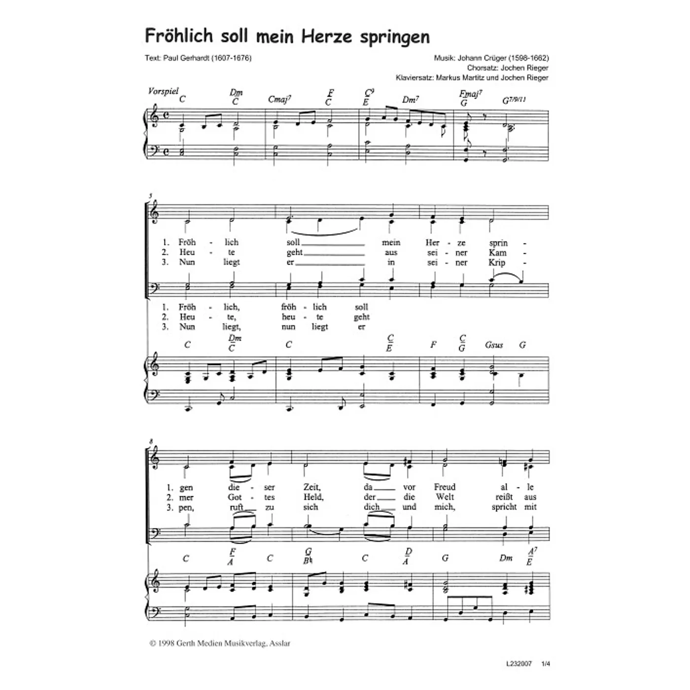 Fröhlich soll mein Herze springen (traditionell, gemischter Chor, mit Akkorden, C-Dur) Johann Crüger (Komposition), Paul Gerhardt (Text), Jochen Rieger (Bearbeiter) | traditionell, gemischter Chor, mit Akkorden, C-Dur | 2,00 € |