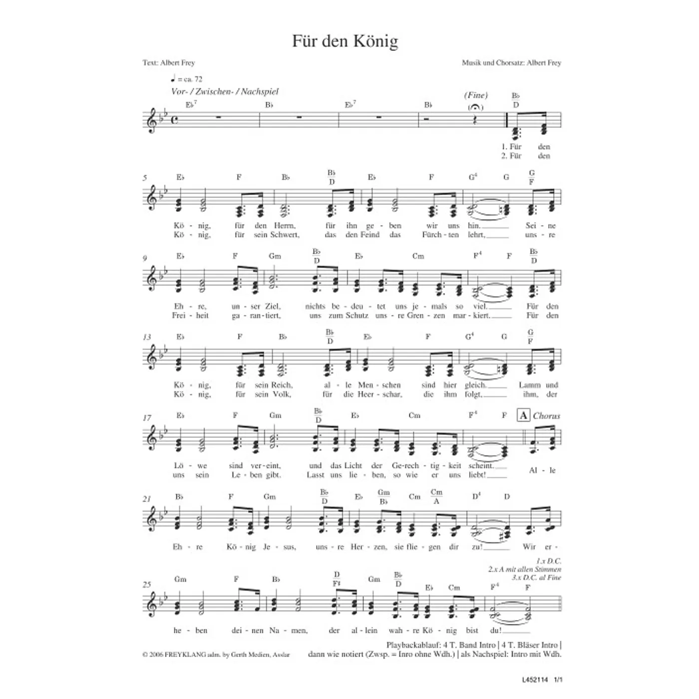 Für den König (modern, Bläser, Bläserpartitur, Partituren, mit Akkorden, vierstimmig, B-Dur) Albert Frey (Komposition, Text, Bläsersatz) | modern, Bläser, Bläserpartitur, Partituren, mit Akkorden, vierstimmig, B-Dur | 2,00 € |