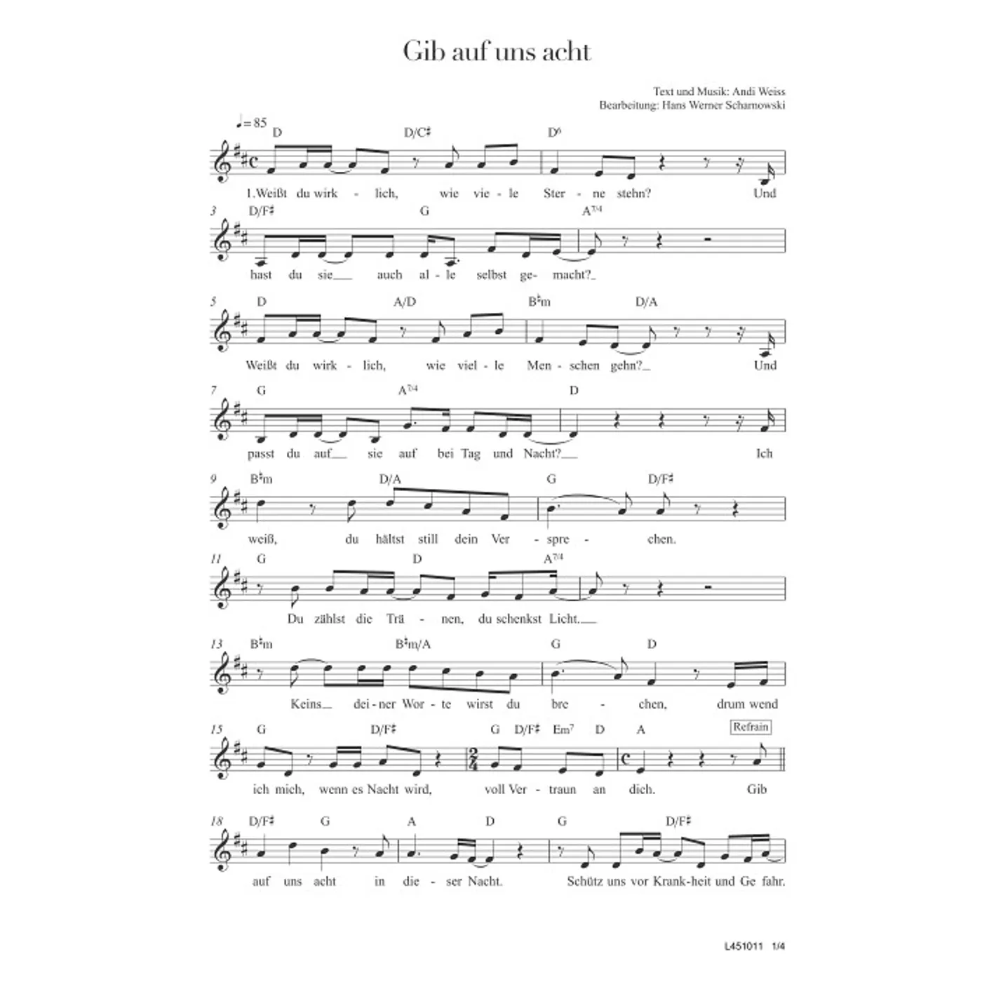 Gib auf uns acht (diese Variante haben Sie gerade ausgewählt) (modern, einstimmig, mit Akkorden, D-Dur) Hans Werner Scharnowski (Klaviersatz), Andi Weiss (Komposition, Text) |