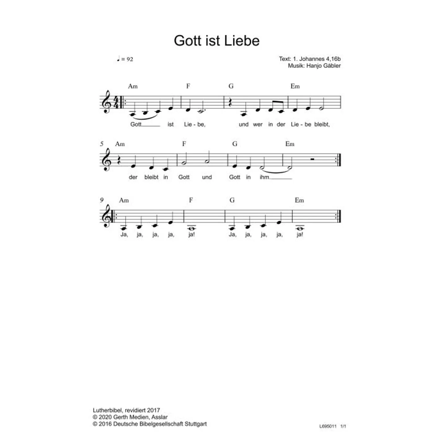 Gott ist Liebe (diese Variante haben Sie gerade ausgewählt) (einstimmig, mit Akkorden, a-moll-Moll) Hanjo Gäbler (Komposition) |