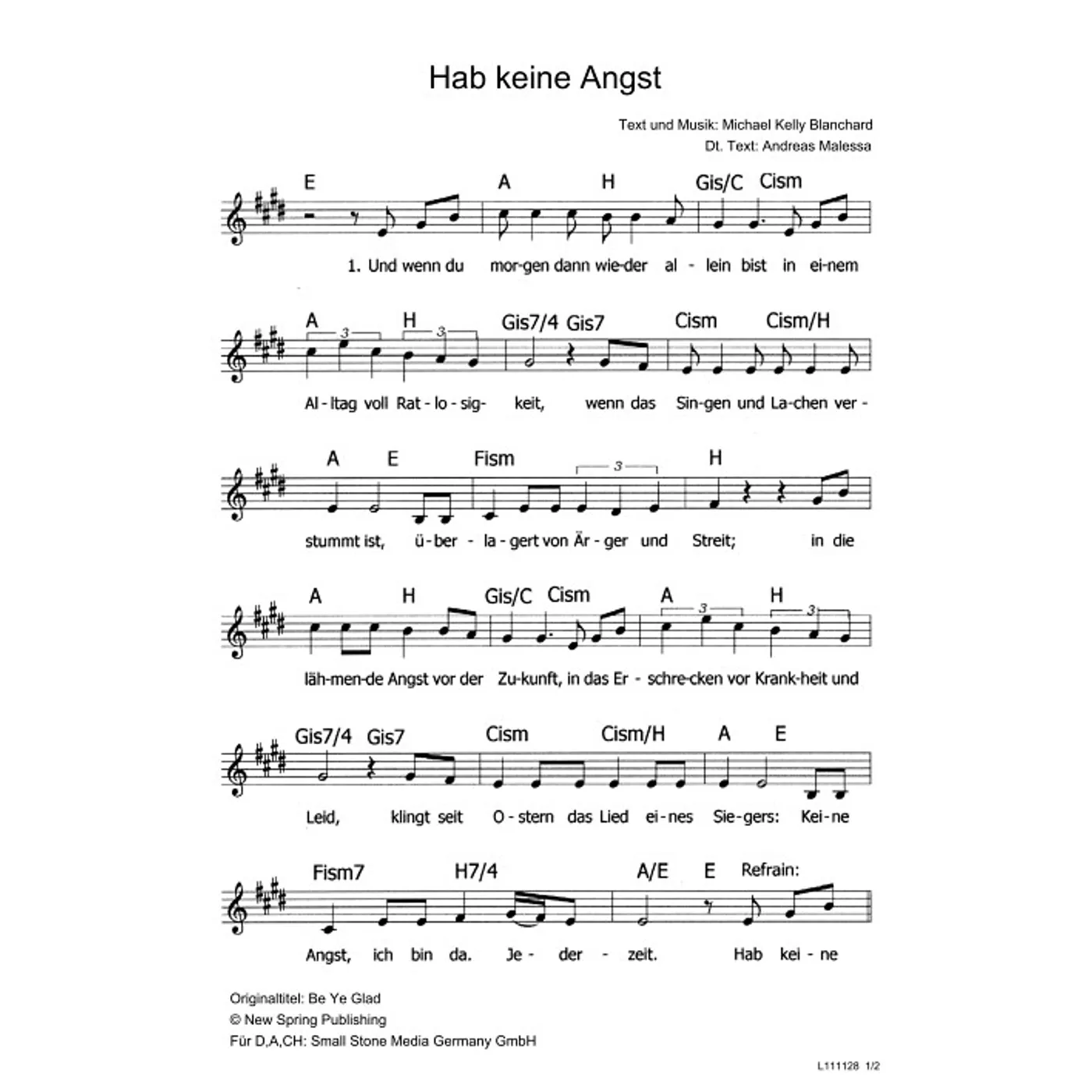 Dies ist ein Download-Artikel und kann nach dem Kauf digital heruntergeladen werden. Vorschau Michael Kelly Blanchard (Komposition, Text) Andreas Malessa (Übersetzung) Hab keine Angst einstimmig mit Akkorden (Noten - Download) Bitte beachten Sie: Downloads sind aktuell nur in Deutschland erhältlich. Bitte wählen Sie aus, für wie viele Kopien/Ausdrucke Sie eine Lizenz erwerben möchten. Die Lizenz wird entsprechend auf dem Dokument vermerkt. 1,50 € Sofort Lieferbar (per Download) Günstige Mengenpreise verfügbar Günstige Mengenpreise (DE) Kaufen Sie 2 zum Preis von je 1,43 € und sparen Sie 5% Kaufen Sie 10 zum Preis von je 1,35 € und sparen Sie 10% Kaufen Sie 25 zum Preis von je 1,28 € und sparen Sie 15% Kaufen Sie 50 zum Preis von je 1,20 € und sparen Sie 20% Kaufen Sie 100 zum Preis von je 1,13 € und sparen Sie 25% Lizenz pro Kopie/Ausdruck: Bestellen Sie den Artikel jetzt auf: Informationen zur Lizenz Details Reihe: So groß ist der Herr Erscheinungstermin: 27.11.2017 Artikel-Nr.: W80028992 Originaltitel: Be Ye Glad Tonart: E-Dur Stil/Genre: modern Satz: einstimmig, mit Akkorden Seitenzahl: 2 S. Hinweise: DIN A4 Dateigröße insg.: 375,3 Kilobyte Dieses Produkt ist preisgebunden: Ja Download-Material: L111128 (PDF) Angaben zum Hersteller nach GPSR: Gerth Medien i.d. SCM Verlagsgruppe GmbH Berliner Ring 62 35576 Wetzlar DEUTSCHLAND info@scm-verlagsgruppe.de Weitere Details Weitere Varianten Noten-Downloads Hab keine Angst (diese Variante haben Sie gerade ausgewählt) (modern, einstimmig, mit Akkorden, E-Dur) Michael Kelly Blanchard (Komposition, Text), Andreas Malessa (Übersetzung) modern, einstimmig, mit Akkorden, E-Dur 1,50 € Die Preise stellen die Einzelpreise der jeweils verfügbaren Einzeldownloads dar. Bewertungen Für dieses Produkt gibt es noch keine Rezensionen.