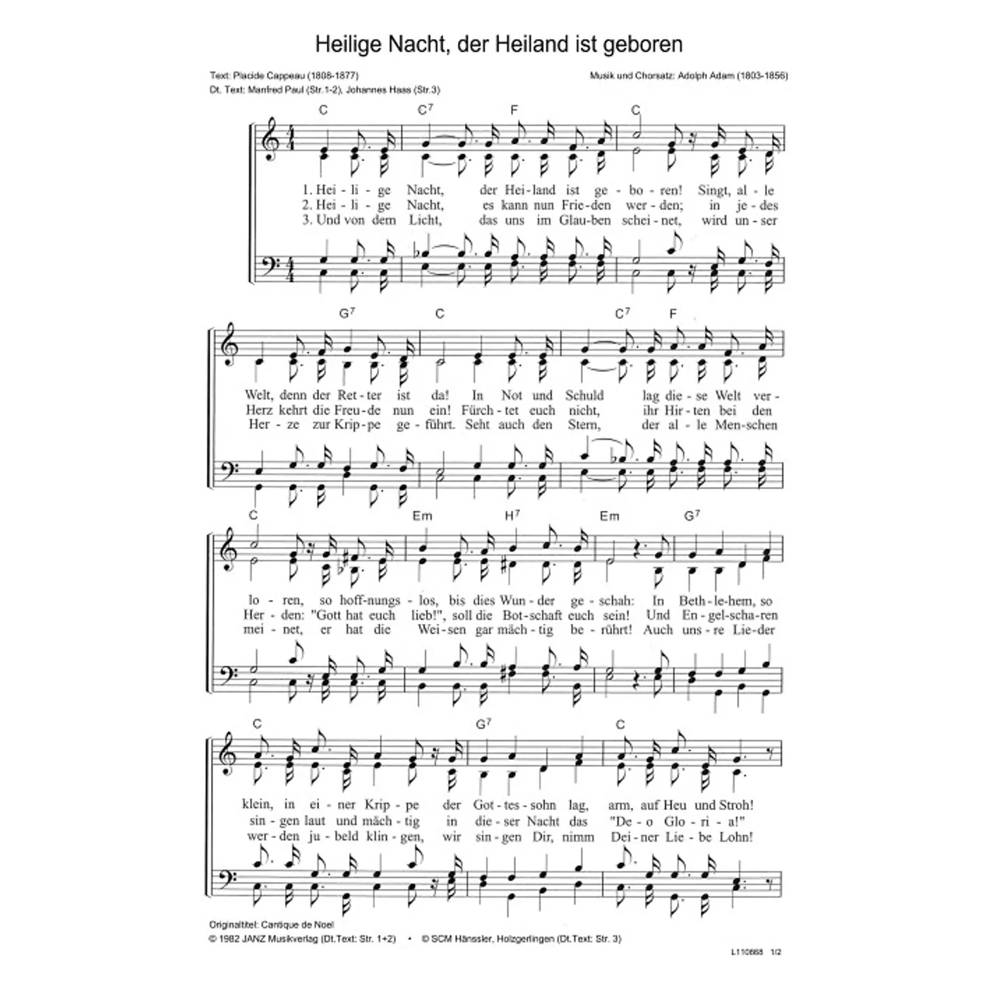 Heilige Nacht, der Heiland ist geboren (diese Variante haben Sie gerade ausgewählt) (traditionell, gemischter Chor, mit Akkorden, vierstimmig, C-Dur) Adolphe Charles Adam (Komposition, Chorsatz), Placide Cappeau (Text), Johannes Haas (Übersetzung), Manfred Paul (Übersetzung) |