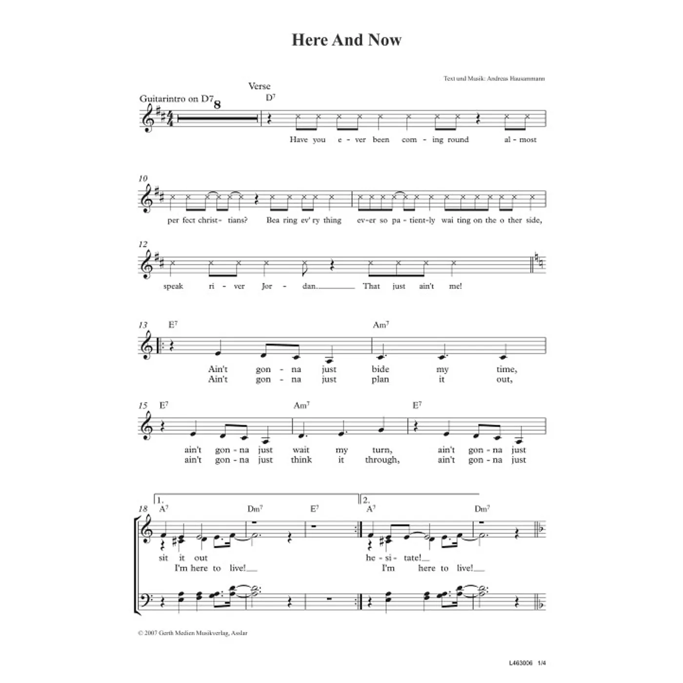 Here And Now (diese Variante haben Sie gerade ausgewählt) (modern, gemischter Chor, mit Akkorden, vierstimmig, D-Dur) Andreas Hausammann (Komposition, Text) |