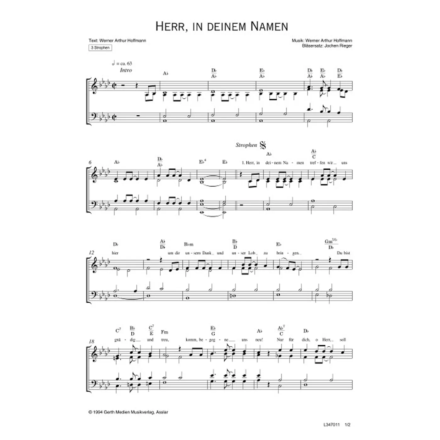 Herr, in deinem Namen (diese Variante haben Sie gerade ausgewählt) (Bläser, Bläserpartitur, Partituren, mit Akkorden, vierstimmig, As-Dur) Werner A. Hoffmann (Text, Komposition), Jochen Rieger (Bearbeiter) |