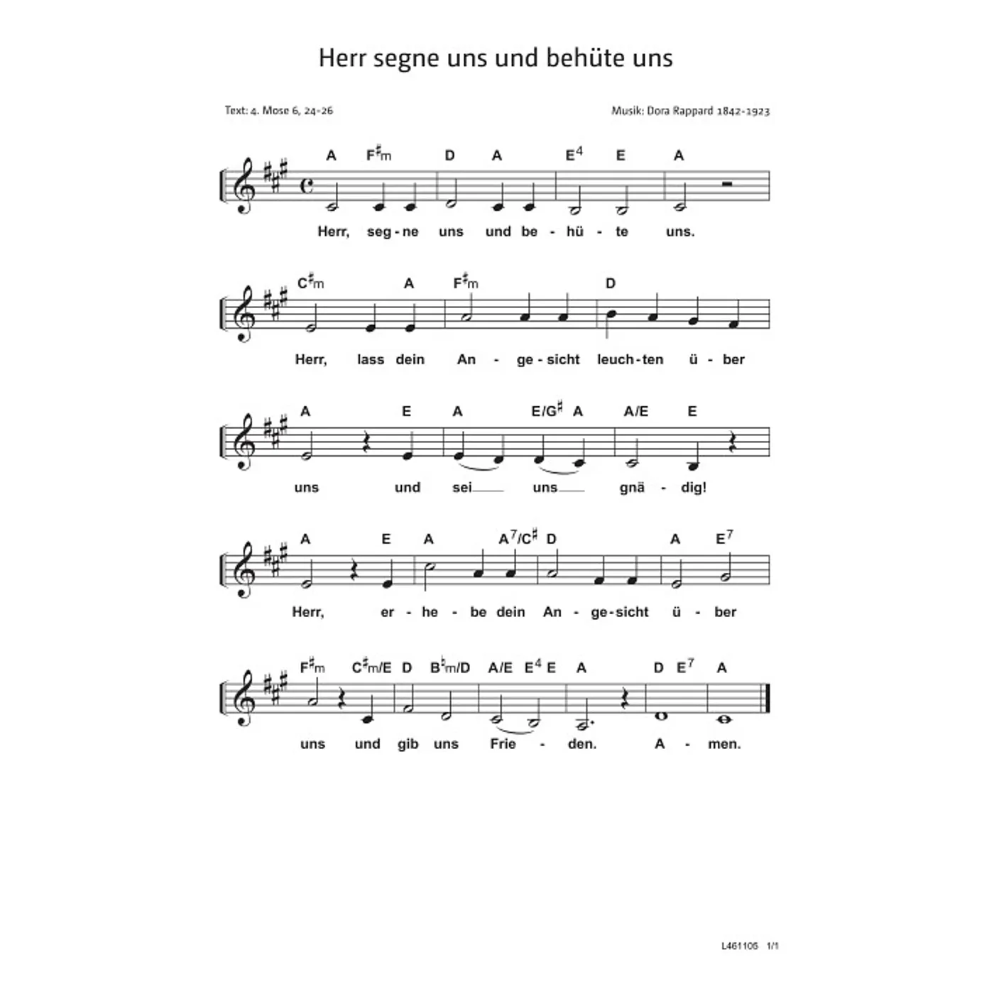 Herr, segne uns und behüte uns (diese Variante haben Sie gerade ausgewählt) (Gemeindelied, traditionell, einstimmig, mit Akkorden, A-Dur) Dora Rappard (Komposition) |