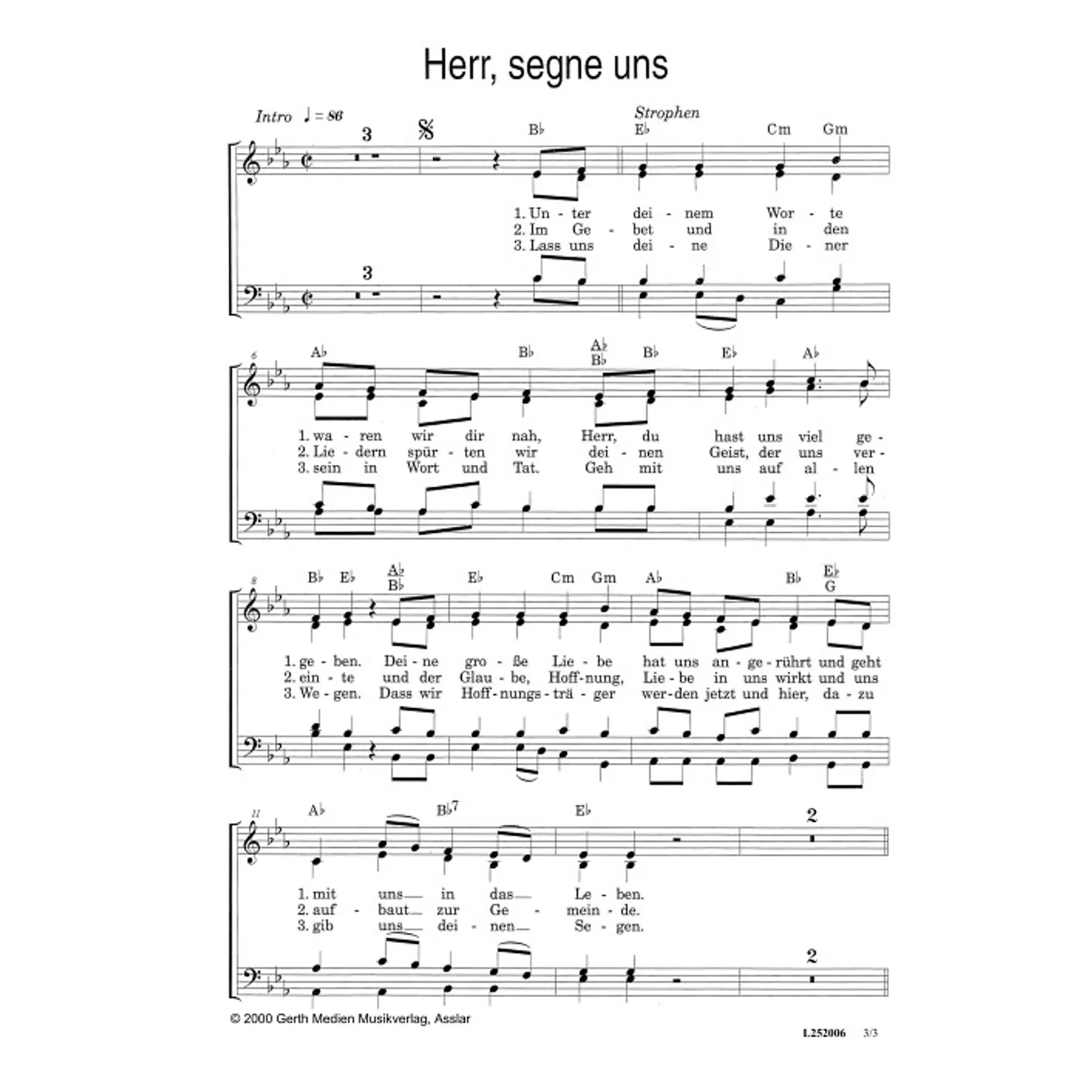 Herr, segne uns (Kantate, modern, Klavier, gemischter Chor, mit Akkorden, vierstimmig, Es-Dur) Johannes Jourdan (Text), David Plüss (Klaviersatz) | Kantate, modern, Klavier, gemischter Chor, mit Akkorden, vierstimmig, Es-Dur | 3,80 € |