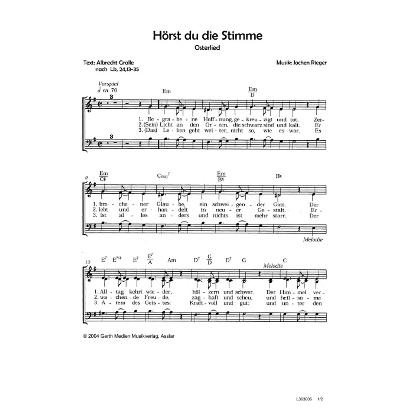Hörst du die Stimme (diese Variante haben Sie gerade ausgewählt) (modern, dreistimmig, gemischter Chor, mit Akkorden, E-Moll) Albrecht Gralle (Text), Jochen Rieger (Komposition, Bearbeiter) |