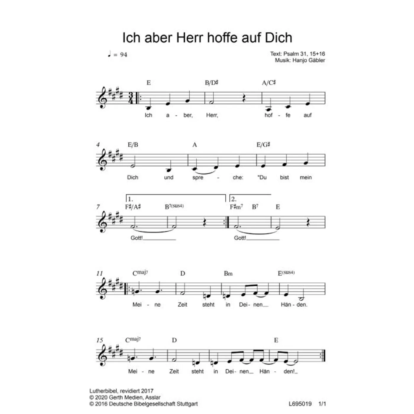 Ich aber, Herr, hoffe auf dich (diese Variante haben Sie gerade ausgewählt) (einstimmig, mit Akkorden, E-Dur) Hanjo Gäbler (Komposition) |