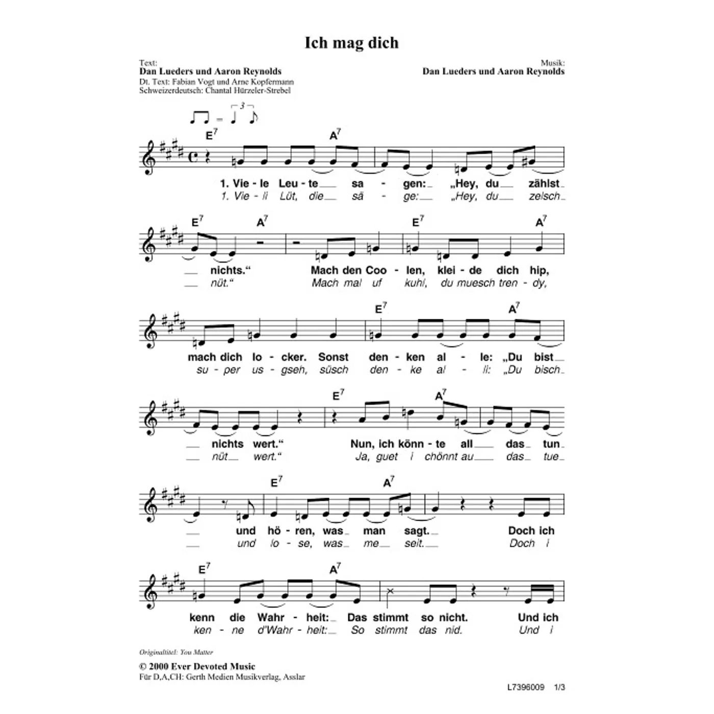 Dies ist ein Download-Artikel und kann nach dem Kauf digital heruntergeladen werden. Vorschau Dan Lueders (Komposition, Text) Aaron Reynolds (Komposition, Text) Chantal Hürzeler-Strebel Arne Kopfermann Fabian Vogt Ich mag dich einstimmig mit Akkorden / Solo | incl. schweizerDt. Text (Noten - Download) Bitte beachten Sie: Downloads sind aktuell nur in Deutschland erhältlich. Bitte wählen Sie aus, für wie viele Kopien/Ausdrucke Sie eine Lizenz erwerben möchten. Die Lizenz wird entsprechend auf dem Dokument vermerkt. Noten - Download Andere Varianten Noten - Download MP3-Track - Download Ich mag dich 2,00 € Sofort Lieferbar (per Download) Günstige Mengenpreise verfügbar Günstige Mengenpreise (DE) Kaufen Sie 2 zum Preis von je 1,90 € und sparen Sie 5% Kaufen Sie 10 zum Preis von je 1,80 € und sparen Sie 10% Kaufen Sie 25 zum Preis von je 1,70 € und sparen Sie 15% Kaufen Sie 50 zum Preis von je 1,60 € und sparen Sie 20% Kaufen Sie 100 zum Preis von je 1,50 € und sparen Sie 25% Lizenz pro Kopie/Ausdruck: Bestellen Sie den Artikel jetzt auf: Informationen zur Lizenz Details Artikel-Nr.: W80035272 Originaltitel: You Matter Tonart: E-Dur Satz: einstimmig, mit Akkorden, Solostimme Seitenzahl: 3 S. Hinweise: DIN A4 Dateigröße insg.: 146,5 Kilobyte Dieses Produkt ist preisgebunden: Ja Download-Material: L7396009 (PDF) Angaben zum Hersteller nach GPSR: Gerth Medien i.d. SCM Verlagsgruppe GmbH Berliner Ring 62 35576 Wetzlar DEUTSCHLAND info@scm-verlagsgruppe.de Weitere Details Weitere Varianten Noten-Downloads Ich mag dich (diese Variante haben Sie gerade ausgewählt) (Solostimme, einstimmig, mit Akkorden, E-Dur) Dan Lueders (Komposition, Text), Aaron Reynolds (Komposition, Text), Chantal Hürzeler-Strebel, Arne Kopfermann, Fabian Vogt Solostimme, einstimmig, mit Akkorden, E-Dur 2,00 € MP3-Downloads Ich mag dich 0,99 € Die Preise stellen die Einzelpreise der jeweils verfügbaren Einzeldownloads dar. Bewertungen Für dieses Produkt gibt es noch keine Rezensionen.