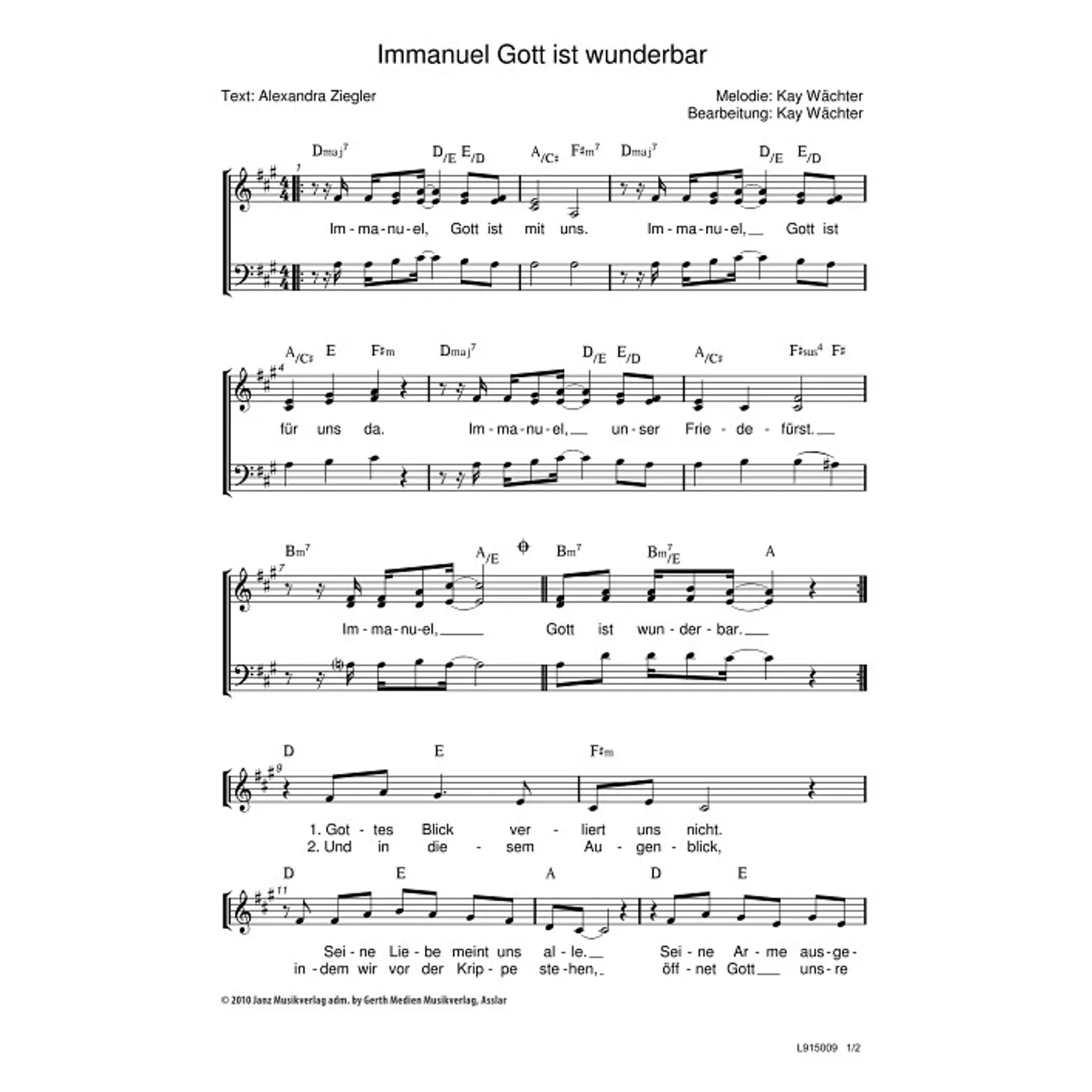 Immanuel, Gott ist wunderbar (diese Variante haben Sie gerade ausgewählt) (modern, dreistimmig, gemischter Chor, mit Akkorden) Kay Wächter (Komposition, Bearbeiter), Alexandra Ziegler (Text) |
