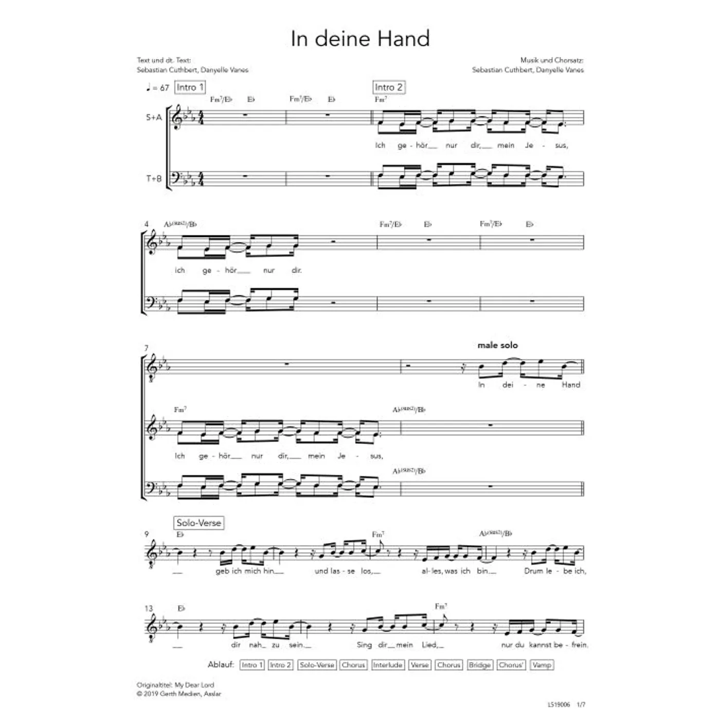In deine Hand (diese Variante haben Sie gerade ausgewählt) (gemischter Chor, mit Akkorden, vierstimmig, Es-Dur) Danyelle Vanes (Komposition, Text), Sebastian Cuthbert (Text, Komposition, Chorsatz) |