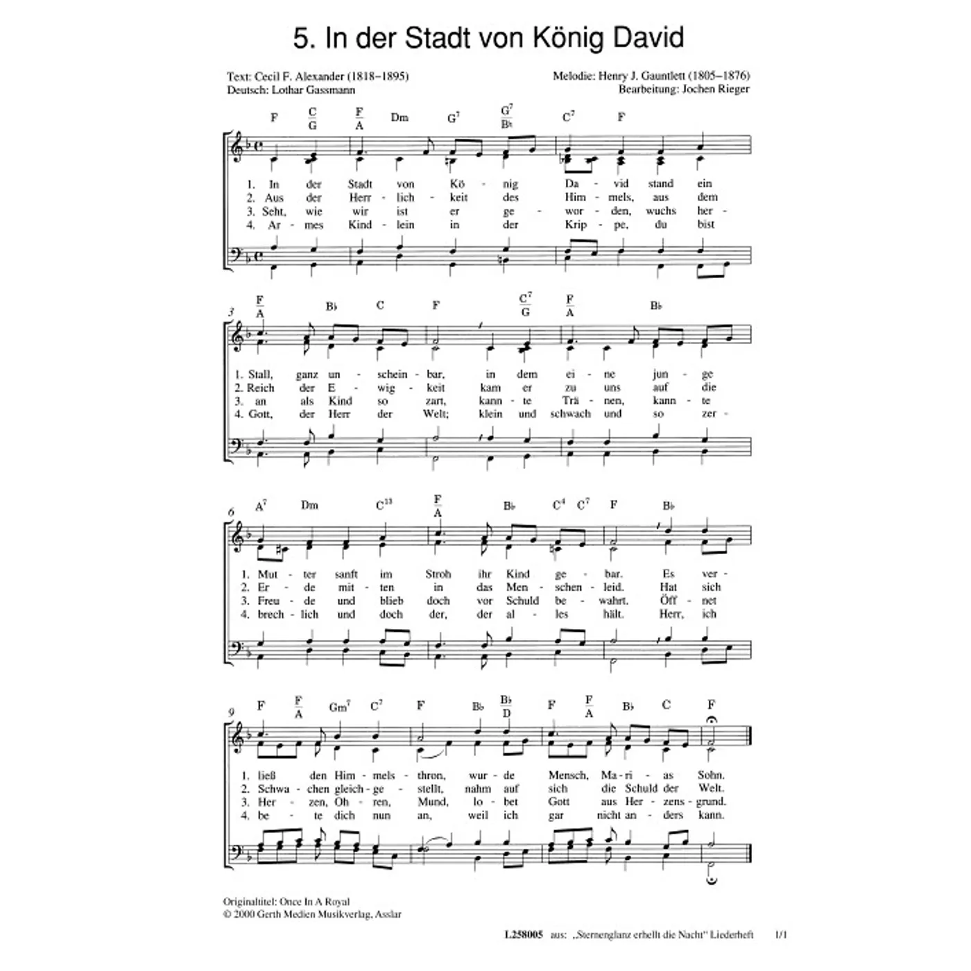 Dies ist ein Download-Artikel und kann nach dem Kauf digital heruntergeladen werden. Vorschau Henry J. Gauntlett (Komposition) Cecil Frances Alexander (Text) Jochen Rieger (Chorsatz) Lothar Gassmann In der Stadt von König David Gemischter Chor SATB (Noten - Download) Bitte beachten Sie: Downloads sind aktuell nur in Deutschland erhältlich. Bitte wählen Sie aus, für wie viele Kopien/Ausdrucke Sie eine Lizenz erwerben möchten. Die Lizenz wird entsprechend auf dem Dokument vermerkt. Noten - Download Andere Varianten Noten - Download MP3-Track - Download In der Stadt von König David 1,50 € Sofort Lieferbar (per Download) Günstige Mengenpreise verfügbar Günstige Mengenpreise (DE) Kaufen Sie 2 zum Preis von je 1,43 € und sparen Sie 5% Kaufen Sie 10 zum Preis von je 1,35 € und sparen Sie 10% Kaufen Sie 25 zum Preis von je 1,28 € und sparen Sie 15% Kaufen Sie 50 zum Preis von je 1,20 € und sparen Sie 20% Kaufen Sie 100 zum Preis von je 1,13 € und sparen Sie 25% Lizenz pro Kopie/Ausdruck: Bestellen Sie den Artikel jetzt auf: Informationen zur Lizenz Details Artikel-Nr.: W80030522 Originaltitel: Once In a Royal Tonart: F-Dur Stil/Genre: modern Satz: gemischter Chor, mit Akkorden, vierstimmig Seitenzahl: 1 S. Hinweise: DIN A4 Dateigröße insg.: 99,0 Kilobyte Dieses Produkt ist preisgebunden: Ja Download-Material: L258005 (PDF) Angaben zum Hersteller nach GPSR: Gerth Medien i.d. SCM Verlagsgruppe GmbH Berliner Ring 62 35576 Wetzlar DEUTSCHLAND info@scm-verlagsgruppe.de Weitere Details Weitere Varianten Noten-Downloads In der Stadt von König David (diese Variante haben Sie gerade ausgewählt) (modern, gemischter Chor, mit Akkorden, vierstimmig, F-Dur) Henry J. Gauntlett (Komposition), Cecil Frances Alexander (Text), Jochen Rieger (Chorsatz), Lothar Gassmann modern, gemischter Chor, mit Akkorden, vierstimmig, F-Dur 1,50 € MP3-Downloads In der Stadt von König David Jochen Rieger (Prod.), Carlos Roncal (Solist) 0,99 € In der Stadt von König David modern, gemischter Chor 0,99 € In der Stadt von König David (Playback ohne Backings) Playback ohne Backings 2,99 € Die Preise stellen die Einzelpreise der jeweils verfügbaren Einzeldownloads dar. Bewertungen Für dieses Produkt gibt es noch keine Rezensionen.