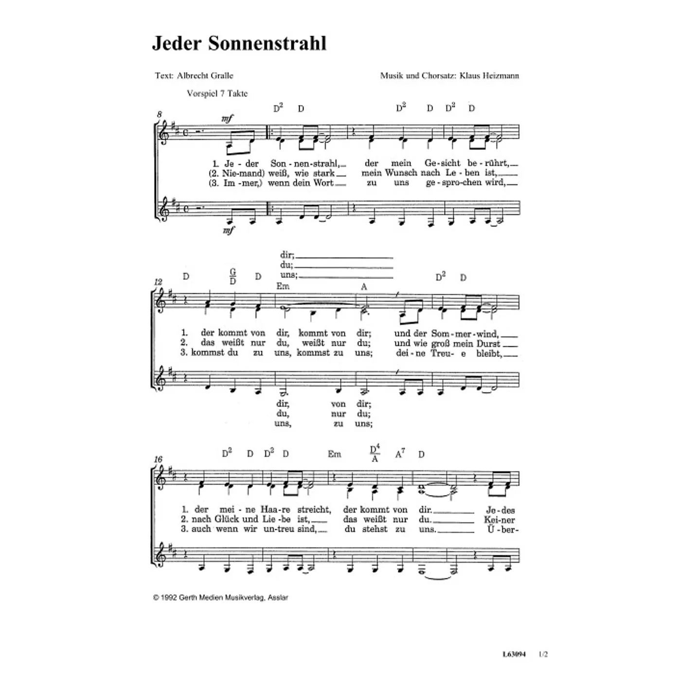 Jeder Sonnenstrahl (diese Variante haben Sie gerade ausgewählt) (traditionell, Frauenchor, dreistimmig, mit Akkorden, D-Dur) Albrecht Gralle (Text), Klaus Heizmann (Komposition, Chorsatz) |