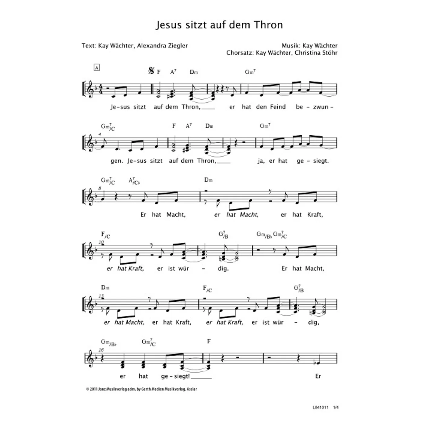 Jesus sitzt auf dem Thron (diese Variante haben Sie gerade ausgewählt) (modern, dreistimmig, gemischter Chor, mit Akkorden, F-Dur) Alexandra Ziegler (Text), Christina Stöhr (Chorsatz), Kay Wächter (Komposition, Text, Chorsatz) |