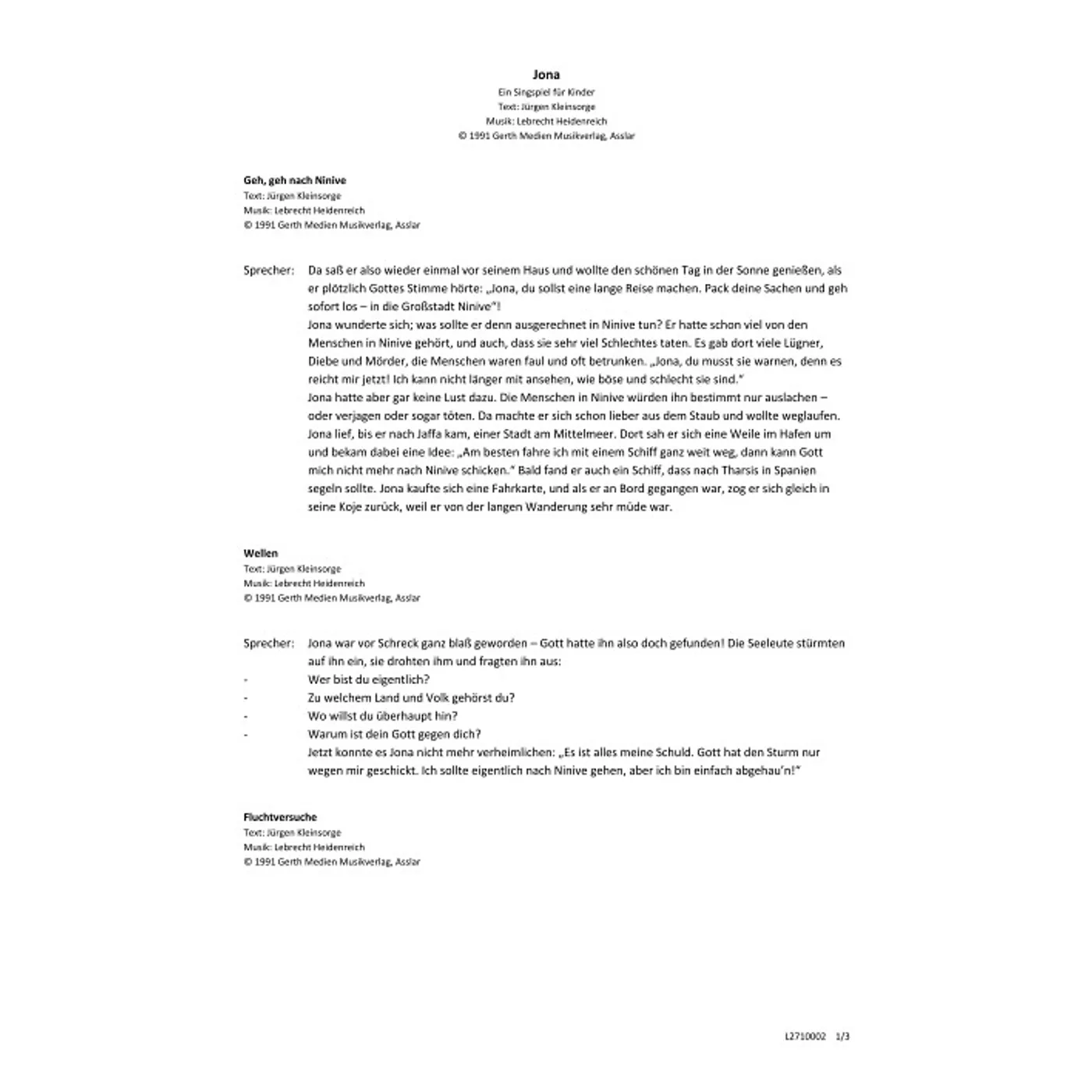 Jona Singspiel für Kinder (Erzählertext) (diese Variante haben Sie gerade ausgewählt) Lebrecht Heidenreich (Musik), Jürgen Kleinsorge (Text) |