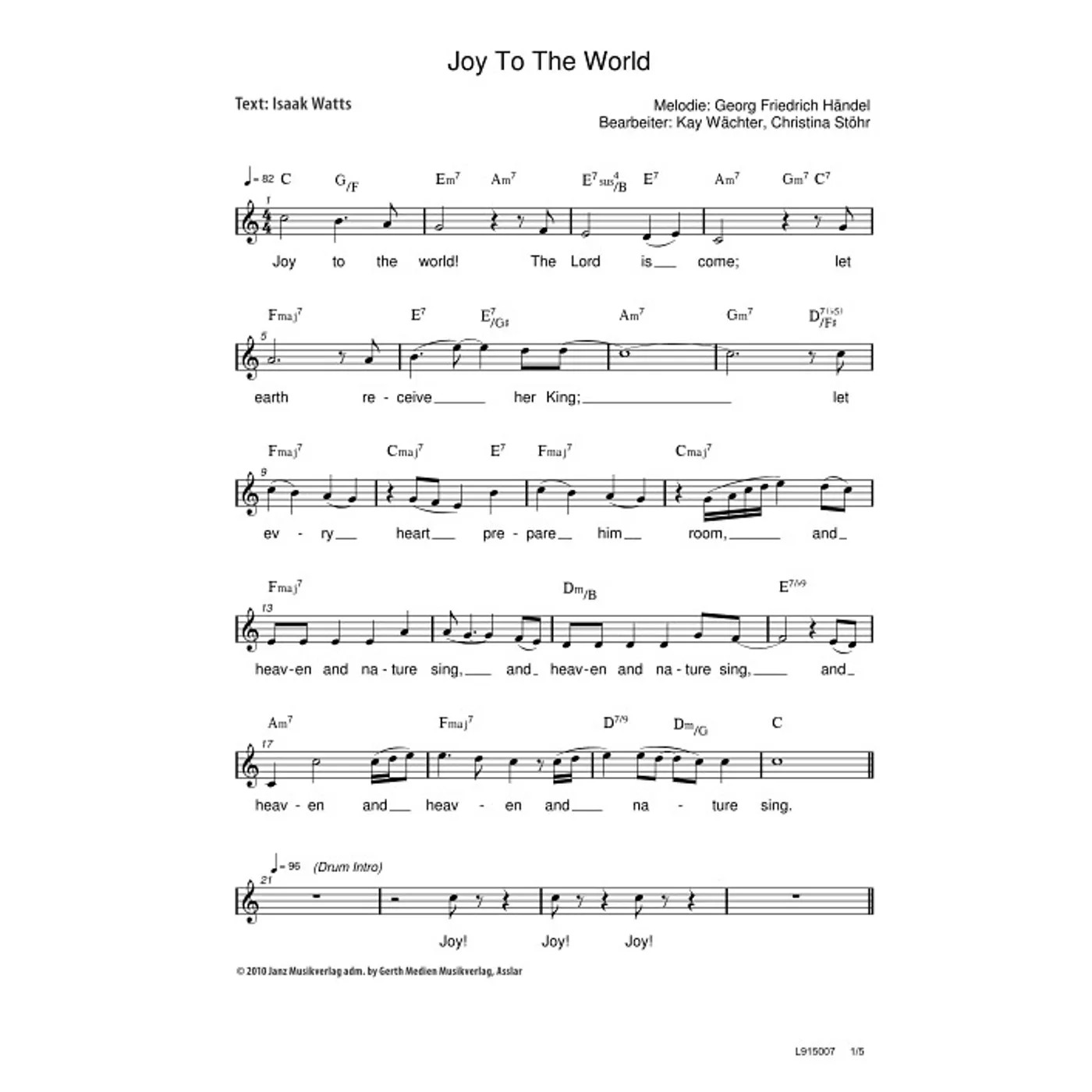 Joy To The World / Freue dich, Welt (modern, dreistimmig, gemischter Chor, mit Akkorden, C-Dur) Chris Lass (Chorsatz) | modern, dreistimmig, gemischter Chor, mit Akkorden, C-Dur | 2,50 € |