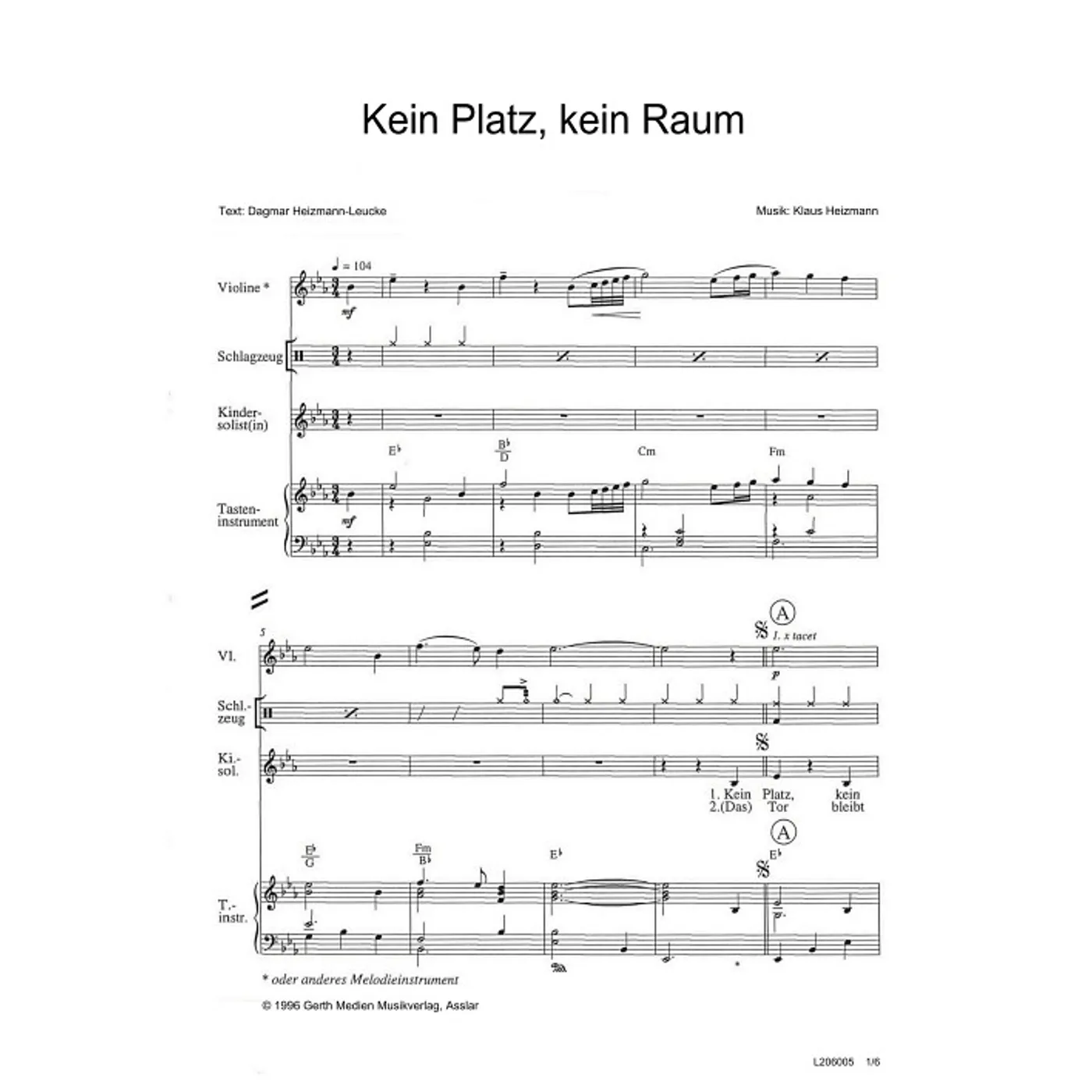 Kein Platz, kein Raum (Kinderchor, Solostimme, mit Akkorden, zweistimmig, Es-Dur) Dagmar Heizmann-Leucke (Text), Klaus Heizmann (Komposition) | Kinderchor, Solostimme, mit Akkorden, zweistimmig, Es-Dur | 1,50 € |