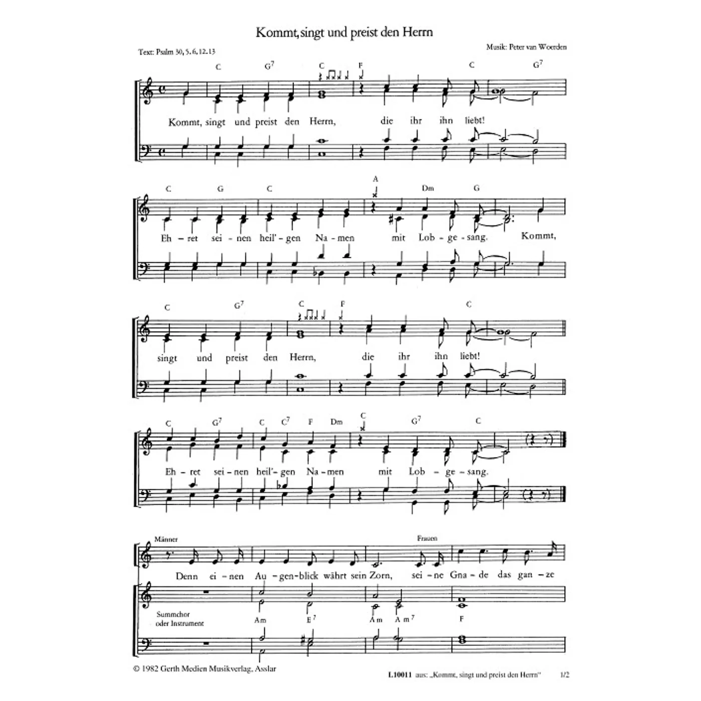 Kommt, singt und preist den Herrn (diese Variante haben Sie gerade ausgewählt) (traditionell, gemischter Chor, mit Akkorden, vierstimmig, C-Dur) Peter van Woerden (Komposition) |