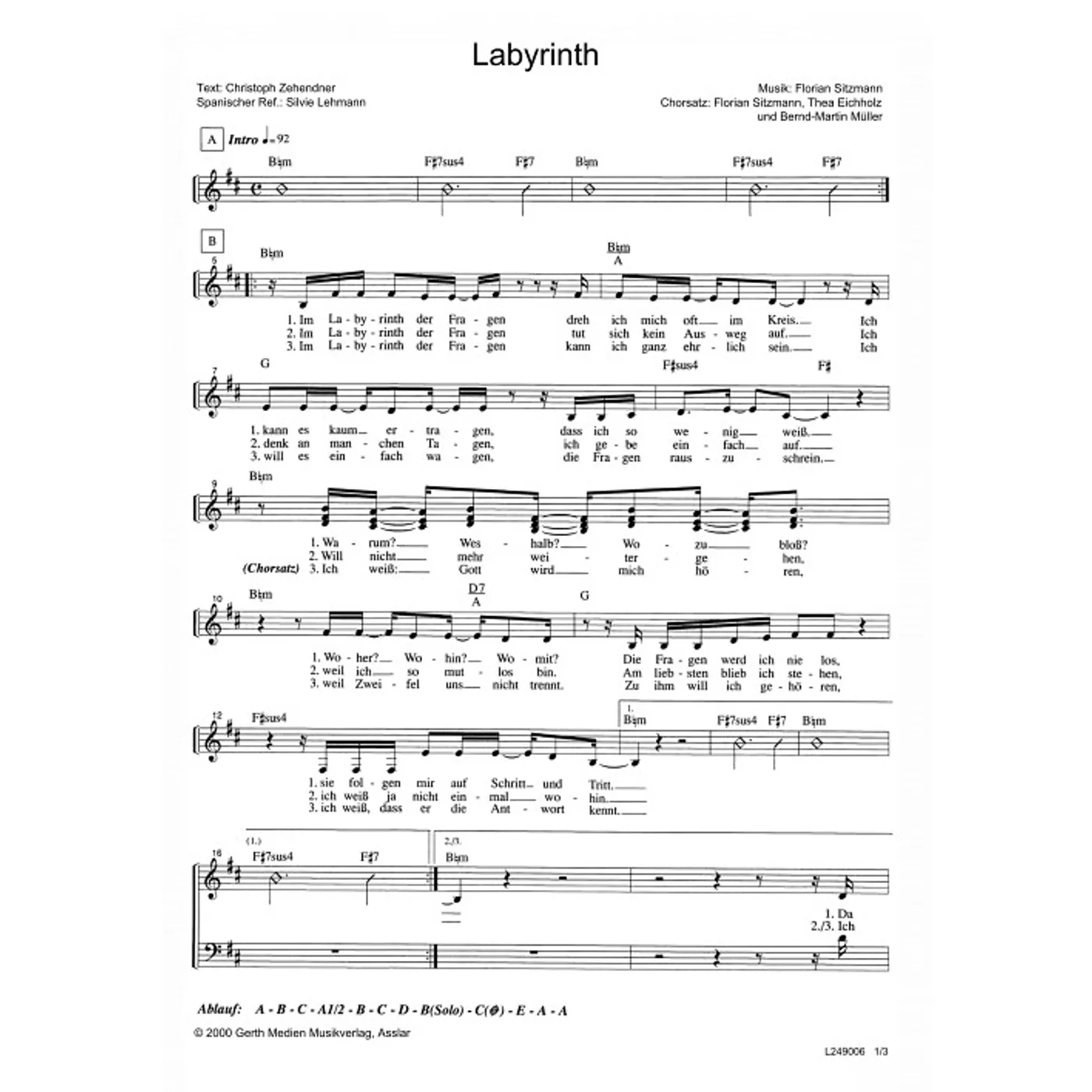 Labyrinth (diese Variante haben Sie gerade ausgewählt) (modern, dreistimmig, gemischter Chor, mit Akkorden, h-Moll) Florian Sitzmann (Komposition, Bearbeiter), Christoph Zehendner (Text), Thea Eichholz (Chorsatz), Silvie Lehmann (Übersetzung), Bernd-Martin Müller (Chorsatz) |