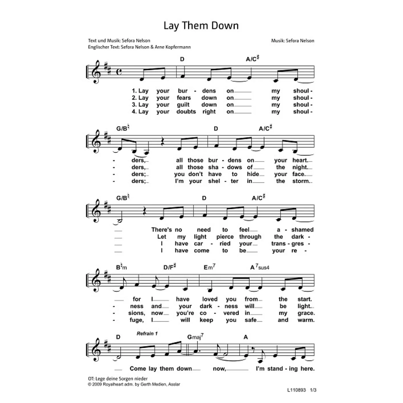 Lege deine Sorgen nieder (Gemeindelied, einstimmig, mit Akkorden, D-Dur) Sefora Nelson (Komposition, Text) | Gemeindelied, einstimmig, mit Akkorden, D-Dur | 1,50 € |