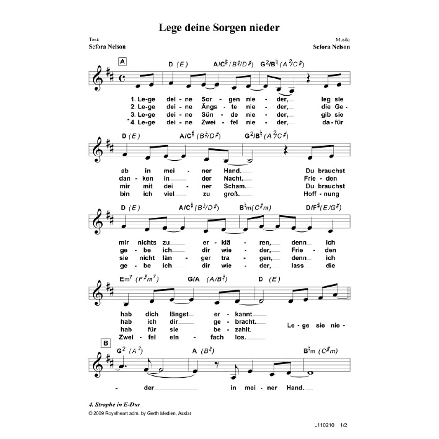 Lege deine Sorgen nieder (diese Variante haben Sie gerade ausgewählt) (Gemeindelied, einstimmig, mit Akkorden, D-Dur) Sefora Nelson (Komposition, Text) |