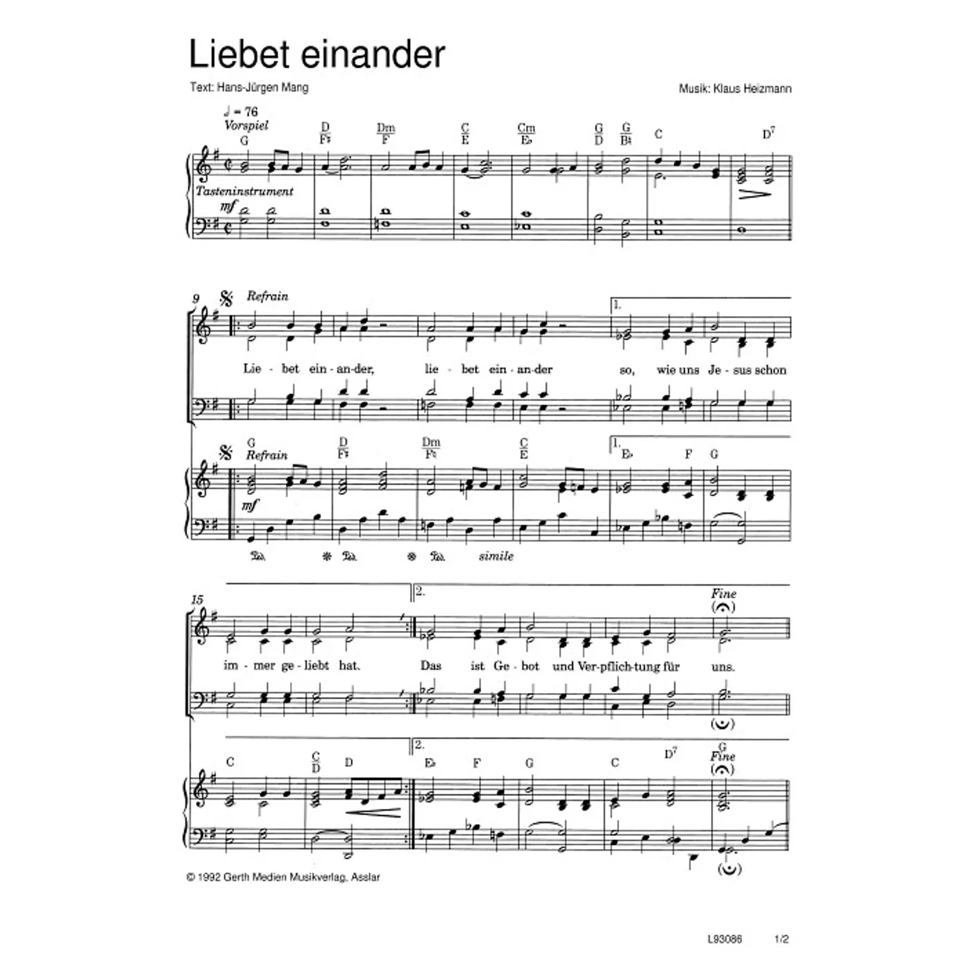 Liebet einander (traditionell, gemischter Chor, mit Akkorden, vierstimmig, G-Dur, gleiche Reihe) Klaus Heizmann (Komposition), Hans-Jürgen Mang (Text) | traditionell, gemischter Chor, mit Akkorden, vierstimmig, G-Dur, gleiche Reihe | 1,50 € |