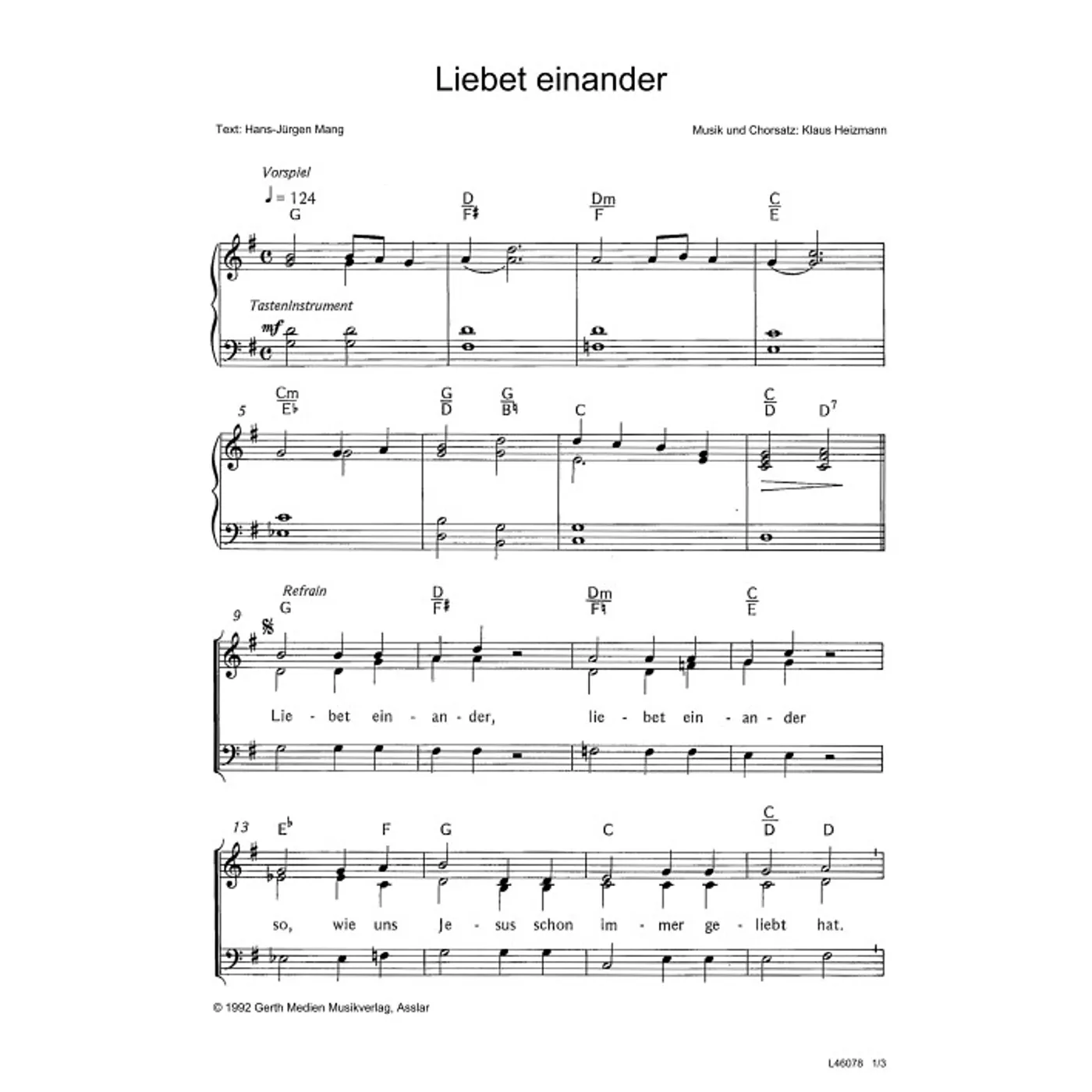 Liebet einander (diese Variante haben Sie gerade ausgewählt) (dreistimmig, gemischter Chor, mit Akkorden, G-Dur) Hans-Jürgen Mang (Text), Klaus Heizmann (Komposition, Chorsatz) |