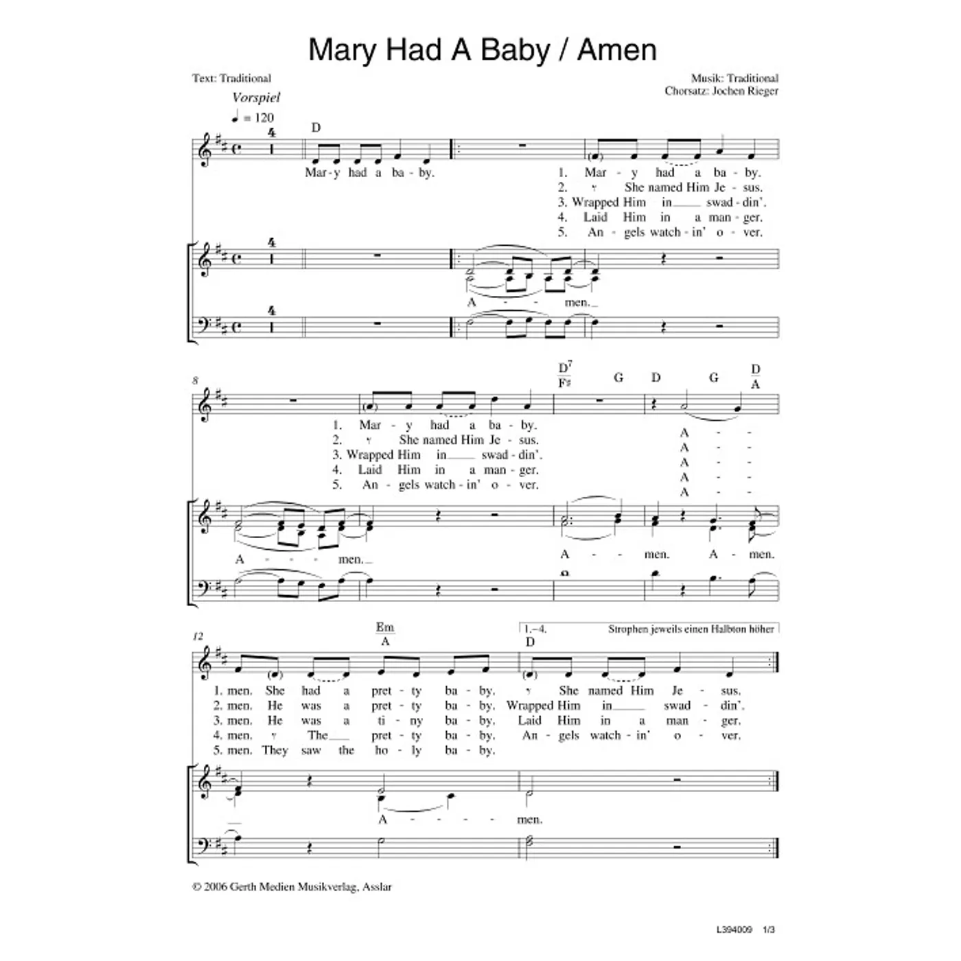 Mary Had A Baby / Amen (diese Variante haben Sie gerade ausgewählt) (modern, dreistimmig, gemischter Chor, mit Akkorden, vierstimmig, D-Dur) Jochen Rieger (Bearbeiter) |