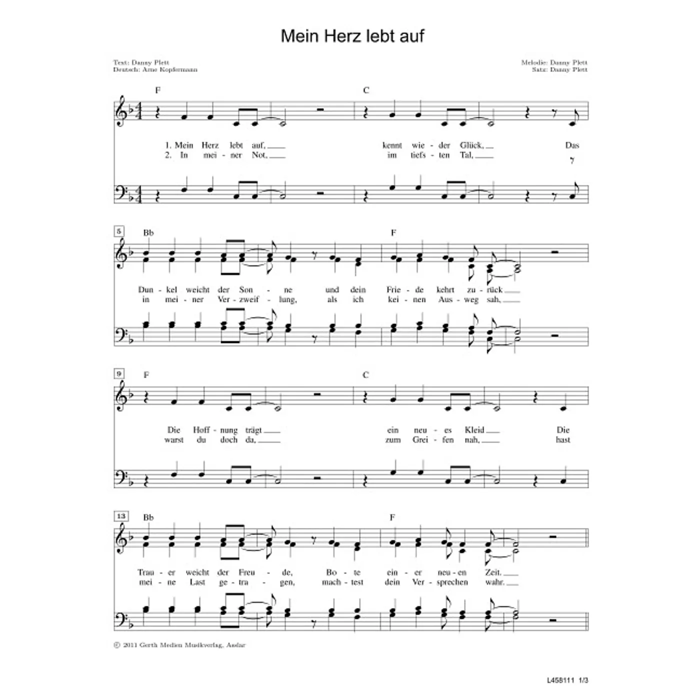Mein Herz lebt auf (diese Variante haben Sie gerade ausgewählt) (modern, gemischter Chor, mit Akkorden, vierstimmig, F-Dur) Arne Kopfermann (Übersetzung), Danny Plett (Komposition, Text, Chorsatz) |